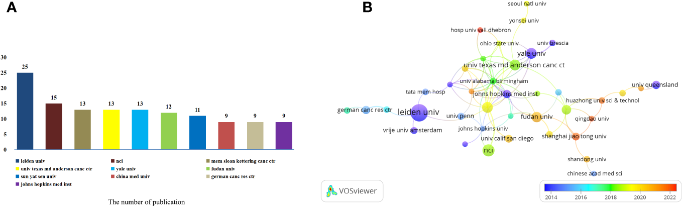 These articles were contributed by a total of 1080 institutions. Among them, the top 10 institutions played a significant role by contributing 129 articles, which accounted for 19.72% of all the articles (Figure 4A). Memorial Sloan-Kettering Cancer Center, The University of Texas MD Anderson Cancer Center and Yale University have an equal number of 13 published articles. China Medical University, German Cancer Research Center and Johns Hopkins Medical Institution also have the same number of published articles, both of which are 9. To further analyze the collaboration patterns, we selected 51 institutions based on the minimum number of publications equal to 5 for visualization, and constructed a collaborative network based on the number and relationship of publications of each institution. As shown in Figure 4B, we observed a close cooperation between Leiden University, Memorial Sloan-Kettering Cancer Center, German Cancer Research Center and Vrije Universiteit Amsterdam. Additionally, there was active collaboration between Fudan University, Shanghai Jiao Tong University, Johns Hopkins Medical Institution and National University Of Singapore. In another interesting finding, we note that the cooperation between Sun Yat Sen University, The University of Texas MD Anderson Cancer Center, Huazhong University of Science And Technology and Qingdao University is very close. Further analysis of the research patterns in different years revealed that Leiden University, Johns Hopkins Medical Institution, Yale University, Johns Hopkins Medical Institution and The University Of Queensland conducted extensive research in 2014. On the other hand, Fudan University, Shanghai Jiao Tong University and Qingdao University have been extensively studied in 2022.