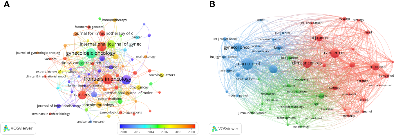 The visualization of journals (A) and co-cited journals (B) on research of immunotherapy in cervical carcinoma.