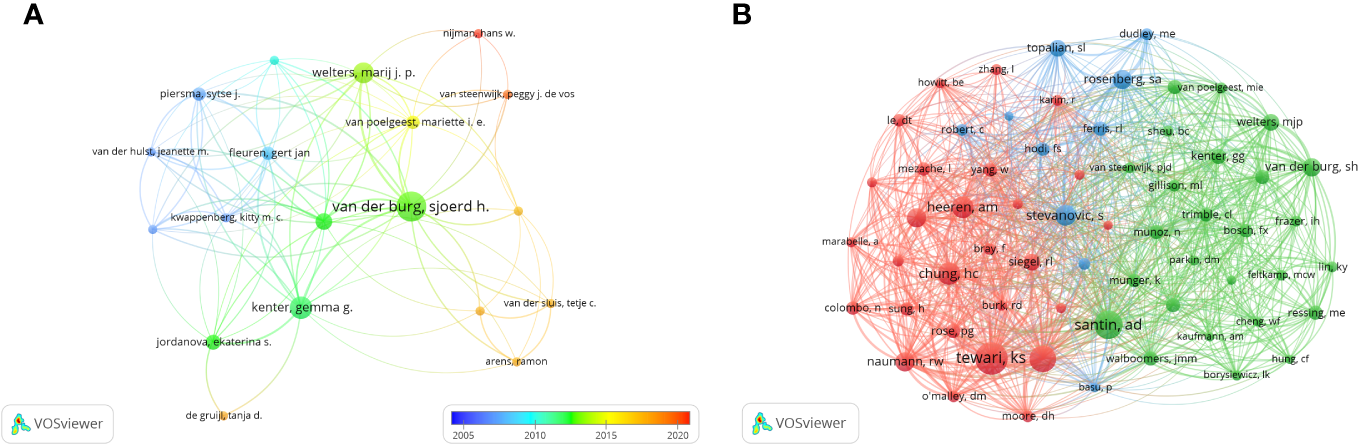 The visualization of authors (A) and co-cited Authors (B) on research of immunotherapy in cervical carcinoma.