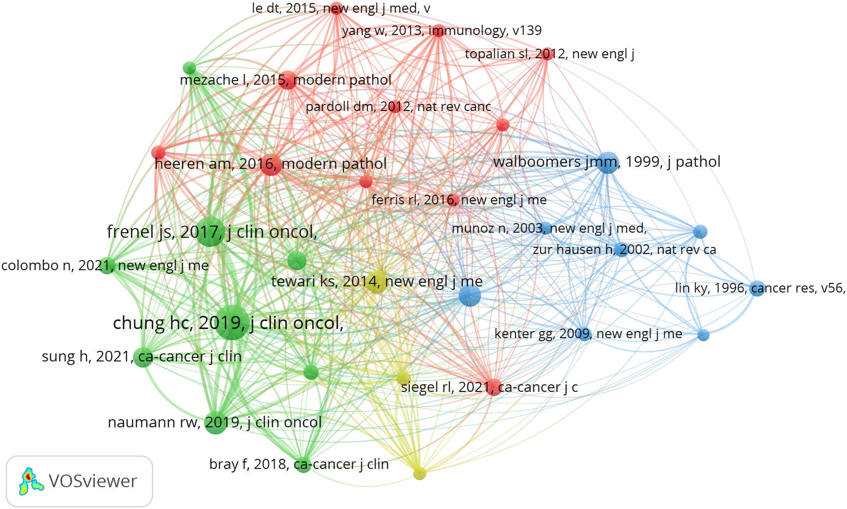In terms of co-citations, among the 20271 co-cited authors, four authors were co-cited more than 100 times (Table 2). The most co-cited author is Tewari, Krishnansu Sujata (n=167), followed by Santin, Alessandro (n=137), Monk, Bradley J (n=131) and Chung, Hung-Chang (n=101). Authors with minimum co-citations equal to 30 were filtered to map co-citation network graphs. As shown in Figure 7B, there are also active collaborations among different co-cited authors, such as Tewari, Krishnansu Sujata and Chung, Hung-Chang, Naumann, R. Wendel and Monk, Bradley J.