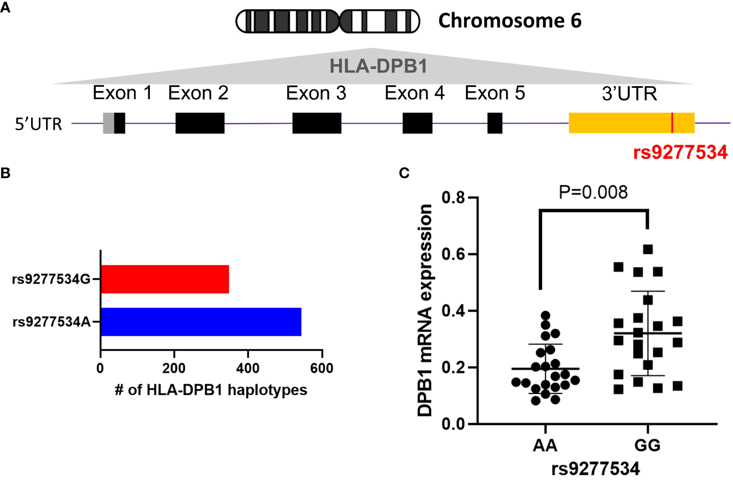 The rs9277534 SNP A or G is linked HLA-DPB1. (A) The schematic representation of the HLA-DPB1 allele within Chromosome 6 HLA region (6p21.1-21.3) is shown. The bottom panel illustrates DPB1 genomic structure, with black boxes denoting coding exons, gray and yellow boxes indicating 5’ and 3’ UTR, respectively. The purple line connecting the boxes represents introns, and the SNP (rs9277534, located in the 3’UTR) is highlighted in red. (B) The number of full genomic HLA-DPB1 haplotypes, containing the rs9277534 SNP, from IMGT/HLA database v3.54. rs9277534 has two groups (rs9277534A and rs9277534G) linked to HLA-DPB1. (C) Examination of the HLA DPB1 expression in 14 BLCLs. Both alleles linked to either rs9277534A or rs9277534G were used for each cell line. HLA-DPB1 mRNA expression was determined through a qRT-PCR assay with experiments involving triplicates. GAPDH served as endogenous control, and the scatter dot plot displays mean standard deviation (SD).