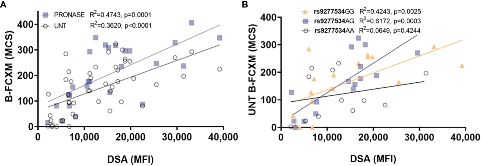 Examining the correlation between DP DSA and B-FCXM. (A) The correlation of DP DSA MFI on B-FCXM with and without pronase (UNT) treatment. (B) A robust linear correlation in B-FCXM with DP DSA against rs9277534GG and AG donor cells, whereas such correlation is not observed in cells with rs9277534AA. MCS, median channel shift.