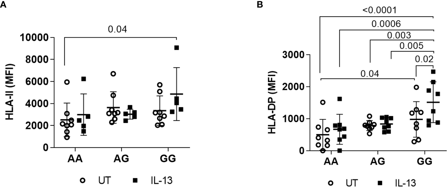 Induction of cell surface expression by IL-13 cytokine. (A) IL-13 induced HLA class II cell surface expression. PBMCs were cultured with IL-13 (100ng/mL) for 48 hours, and cells stained with anti HLA-II antibodies were gated out of PBMCs. (B) IL-13 induced HLA DP cell surface expression on PBMCs. The combinations of AA, AG, and GG represent the two DPB1 alleles present in each donor cell, linked to the rs9277534 SNP. Only p values of < 0.05, considered statistically significant, are marked. The scatter dot plot presents mean SD.