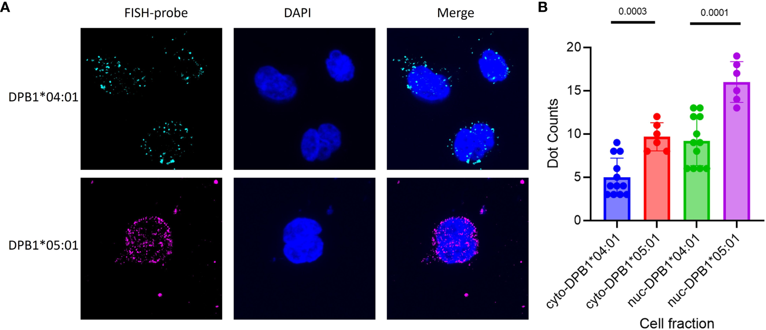 FISH of DPB1 was conducted on BLCLs to assess the expression of DPB1 mRNA in cellular compartments. Two high-frequency HLA-DPB1 alleles were chosen for the primary test, with one BLCL being homozygous for DPB1*04:01 linked to rs9277534AA and the other homozygous for DPB1*05:01 linked to rs9277534GG. (A) Representative RNA FISH images of DPB1*04:01 (Cyan) and DPB1*05:01 (Magenta) RNA in BLCLs, with DAPI staining the nucleus (Blue). (B) The Box plot showing cytoplasmic and nuclear FISH counts for DPB1*04:01 and DPB1*05:01. The prefixes “cyto-” and “nuc-” denote the cytoplasmic and nuclear compartments, respectively, within a cell fraction.
