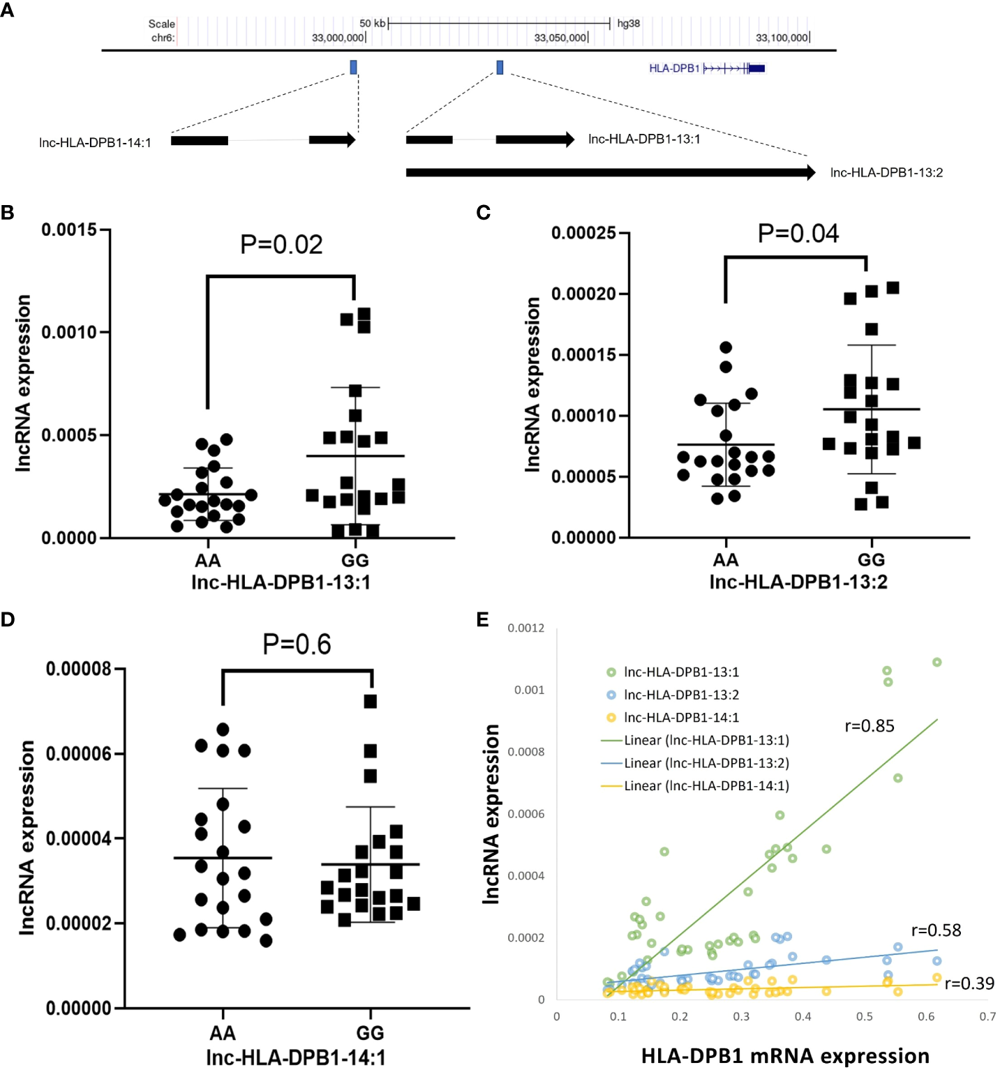 As shown by qRT-PCR experiments, the expression of lnc-HLA-DPB1-13:1 RNA (p=0.02; Figure 5B) and lnc-HLA-DPB1-13:2 RNA (p=0.04; Figure 5C) was significantly higher in BLCLs carrying the rs9277534GG genotype compared to the rs9277534AA genotype. However, no significant difference in the expression of lnc-HLA DPB1-14:1 was observed in BLCLs (p=0.6, Figure 5D). Furthermore, a robust correlation was identified between lnc-HLA-DPB1-13:1 and DPB1 mRNA expression (r=0.85, p<0.0001, Figure 5E), whereas no such correlation was observed for lnc-HLA-DPB1-13:2 and lnc-HLA-DPB1-14:1. These findings imply a potential pivotal role of lnc-HLA-DPB1-13:1 in the molecular regulation of mRNA expression of DPB1.