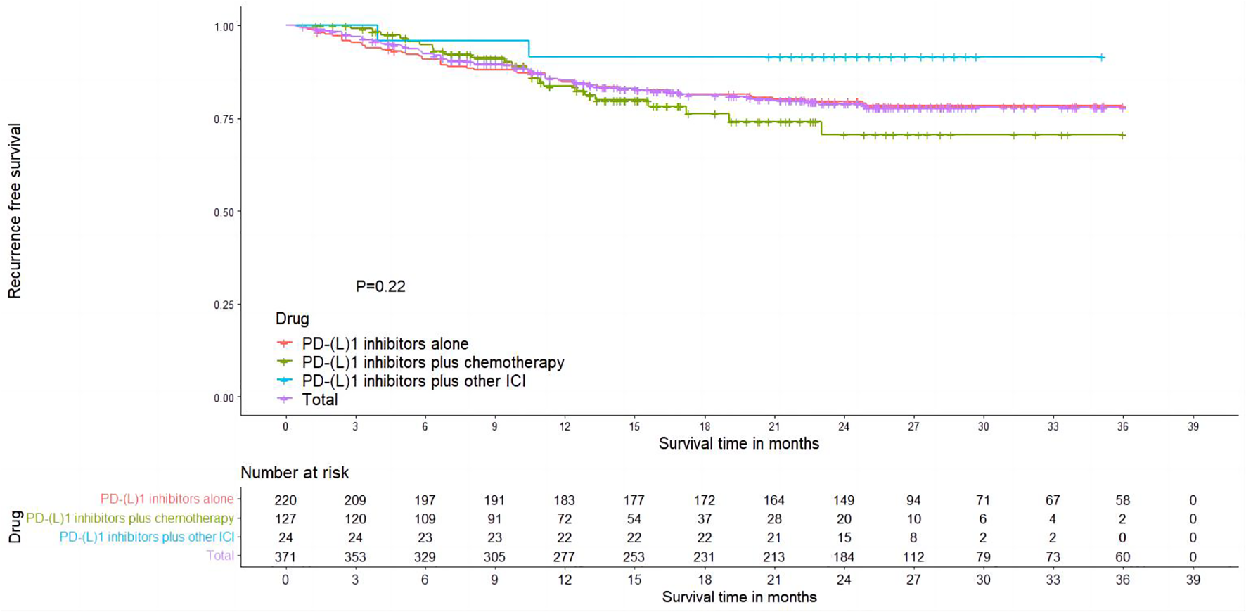 In total, 22 studies were included for meta-analysis. The overall pooled pCR of neoadjuvant PD-(L)1 inhibitors was 0.36 (95%CI=0.30–0.42, p=0.00). In subgroup meta-analysis, the pooled PCR of PD-(L)1 inhibitors alone, PD-(L)1 inhibitors plus other ICI, and PD-(L)1 inhibitors plus chemotherapy was 0.27 (95%CI=0.19–0.35, p=0.1), 0.41 (95%CI=0.21–0.62, p=0.01), 0.43 (95%CI=0.35–0.50, p=0.06), respectively. The overall pooled pPR of neoadjuvant PD-(L)1 inhibitors was 0.53 (95%CI=0.46–0.60, p=0.00). In subgroup meta-analysis, the pooled pPR of PD-(L)1 inhibitors alone, PD-(L)1 inhibitors plus other ICI, and PD-(L)1 inhibitors plus chemotherapy was 0.36 (95%CI=0.22–0.51, p=0.01), 0.51 (95%CI=0.39–0.62, p=0.43), and 0.61 (95%CI=0.53–0.69, p=0.01), respectively. Kaplan–Meier curves for OS and RFS were reconstructed, but there was no significant difference among three groups in terms of OS or RFS. The pooled result of Grade≥ 3 irAEs rate for neoadjuvant PD-(L)1 inhibitors was 0.15 (95%CI=0.09–0.22, p=0.00%). In subgroup analysis, the pooled result of Grade≥ 3 irAEs rate for PD-(L)1 inhibitors alone, PD-(L)1 inhibitors plus other ICI, and PD-(L)1 inhibitors plus chemotherapy was 0.07 (95%CI=0.04–0.11, p=0.84), 0.31 (95%CI=0.16–0.47, p=0.06), and 0.17 (95%CI=0.06–0.31, I2 = 71.27%, p=0.01), respectively.