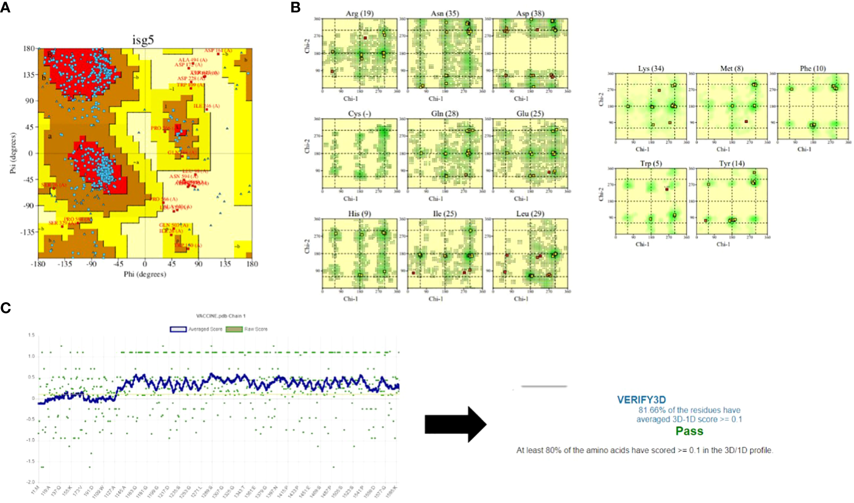 The iTESSOR (Iterative Threading ASSEmbly Refinement modeling tool) was employed to predict the three-dimensional structure of the final vaccine construct (44). iTESSOR employs a hierarchical method combining template-based fragment assembly, structural refinement, and threading (45). To predict a structure, it breaks the query sequence into fragments and utilizes all the structured sequences present in the Protein Data Bank (PDB) as templates against it (46). Upon prediction, it further refines the structure using specific algorithms. Because of this combined approach, iTESSOR is now at the forefront of protein structure prediction, allowing for precise structure prediction for a wide range of protein folds and sequences (47). The obtained structure was further refined using the Galaxy Refine tool to enhance stability (48). The stability of the vaccine structure was examined using Verify3D and PDBsum tools (49, 50).