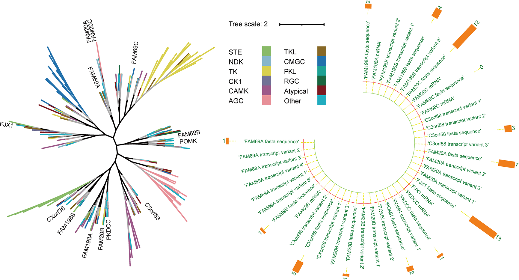 Representation of the evolutionary relation analysis of the secretory pathway kinase or kinase-like proteins in human kinome. Left: The black branches represent the development process of the phylogenetic tree of all kinases (branches of different colors represent different kinase groups). Right: The orange bar chart represents the number of disease literature related to the corresponding genes.