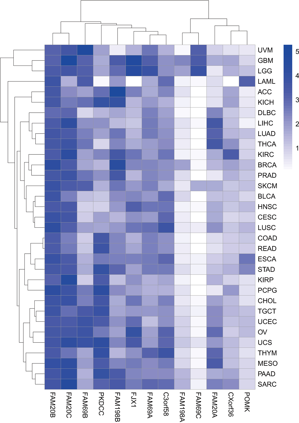 Heatmap of gene expression in pan-cancer. Heatmap showing the association of 13 genes encoding secretory pathway kinases or kinase-like proteins with indicated cancer types in the TCGA pan-cancer RNA sequencing dataset downloaded from UCSC Xena (https://xena.ucsc.edu). The color code represents the expression level of the 13 genes, with the most significant high expression in dark blue.