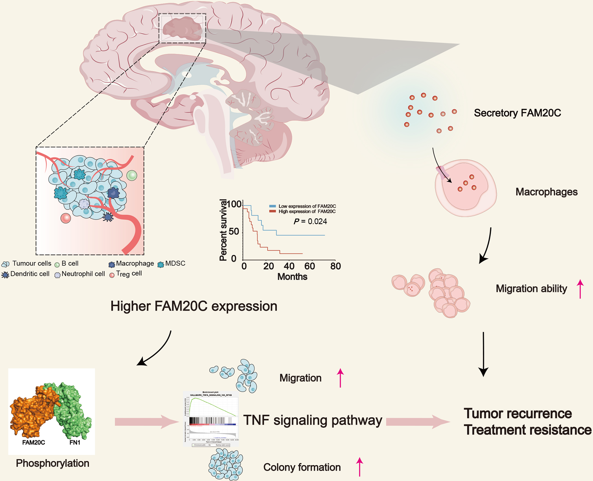 The schematic diagram depicts the role of FAM20C in promoting GBM progression. GBM with high FAM20C expression is associated with poor prognosis, and FAM20C promotes the migration and clone formation of tumor cells by binding with FN1 and activating the TNF signaling pathway. Also, FAM20C secreted by tumor cells promotes the migration of tumor-associated macrophages, which plays an important role in the development of tumors, modulation of neoangiogenesis, immune suppression, and metastasis. This may lead to tumor recurrence and treatment resistance.