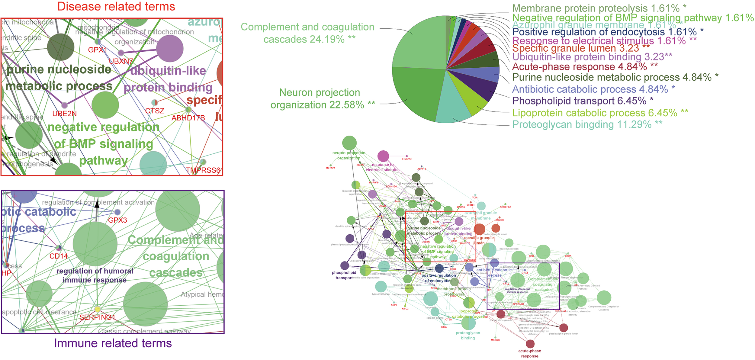 GO and KEGG analysis based on co-regulated genes with the SPKKP signature score in pan-cancer. Each node represents a gene ontology term, while the edges are quantitative representations of shared gene membership. The different colors of the nodes represent the different groups generated. The pie chart represents the ClueGo pathway groups by the percentage of gene ontology (GO) terms contained.