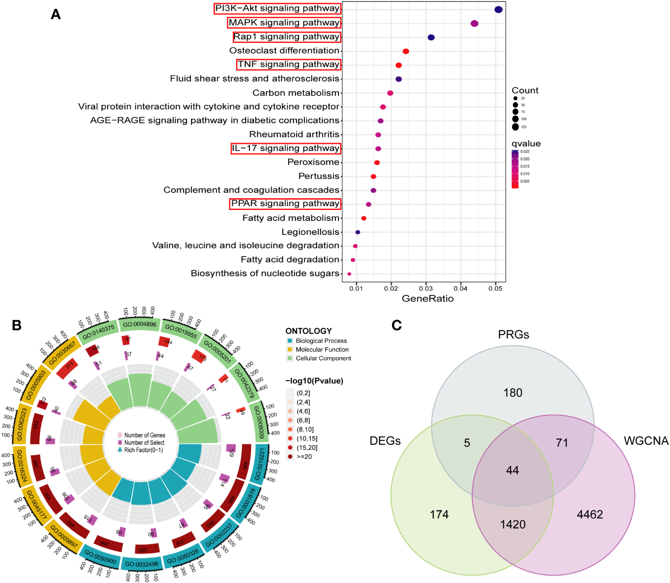 Functional enrichment analysis of key module genes and identification of candidate diagnostic genes. (A) The bubble plot showing the most enriched KEGG pathways of key module. (B) Gene Ontology analysis of key module. (C) Candidate diagnostic genes were obtained by overlapping key modules, DEGs and PRGs. DEGs, differentially expressed genes; PRGs, platelet-related genes; KEGG, kyoto encyclopedia of genes and genome; BP, biological process; CC, cellular component; MF, molecular function.
