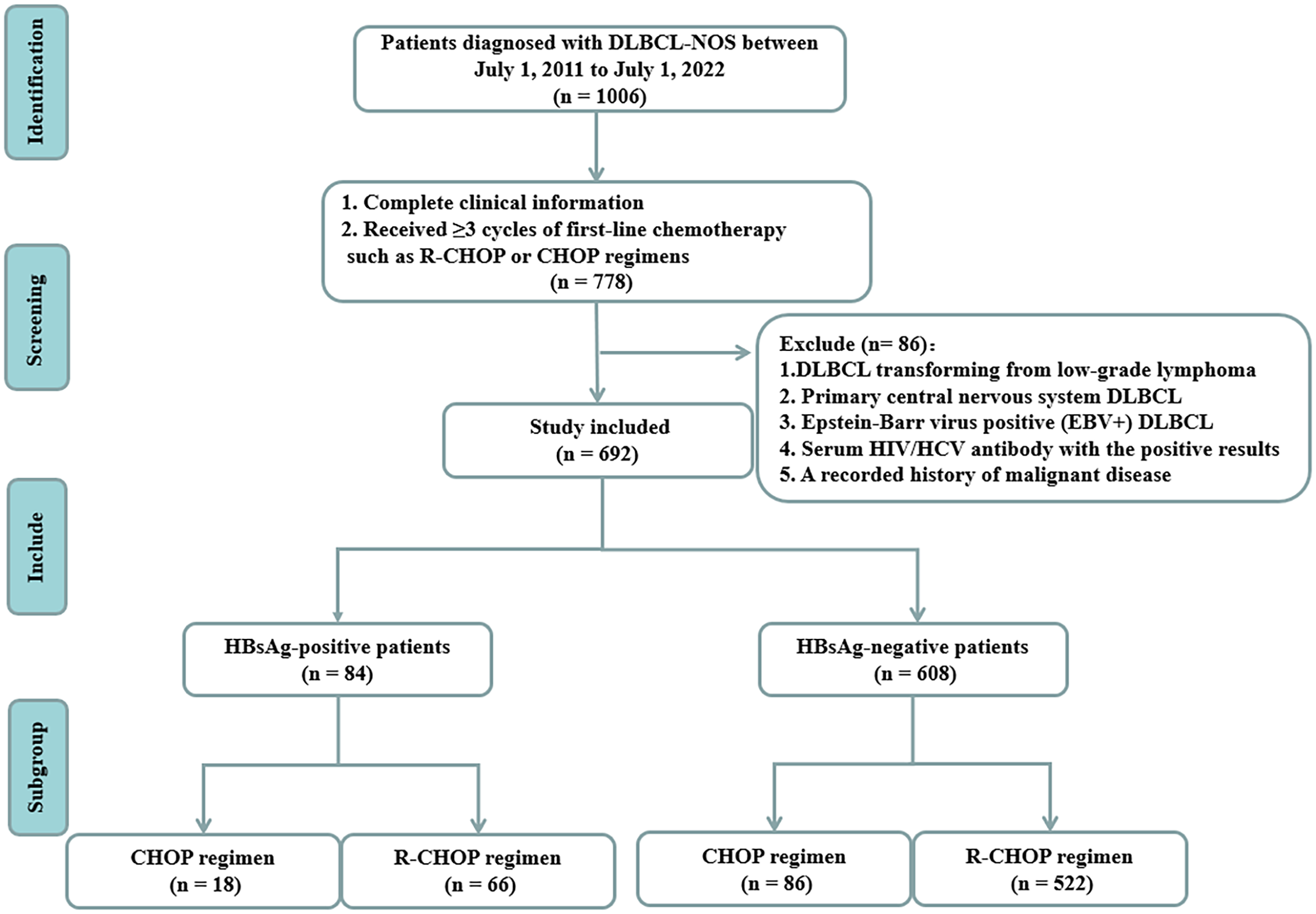 The initial treatment strategy (including chemotherapy drug intensity and course) was similar between DLBCL patients with HBsAg-positive and negative in this study. In the HBsAg-positive group (n=84), 18 patients were treated with CHOP regimen and 66 patients with R-CHOP regimen. Among the 608 HBsAg-negative patients, 86 patients were treated with CHOP regimen and 522 patients with R-CHOP regimen. Serum HBV-DNA testing was performed prior to the initiation of chemotherapy and immunotherapy for all DLBCL patients, which excluded patients who had tested positive solely for anti-HBs or those who were negative for all five Hepatitis B tests. Prophylactic antiviral therapy is initiated when the treatment regimen includes medications associated with a high risk of HBV reactivation, such as glucocorticosteroids, rituximab, and anthracyclines. Antiviral prophylaxis (using lamivudine and entecavir) is maintained from initial chemotherapy to at least six months after completion of last chemotherapy for preventing HBV reactivation.