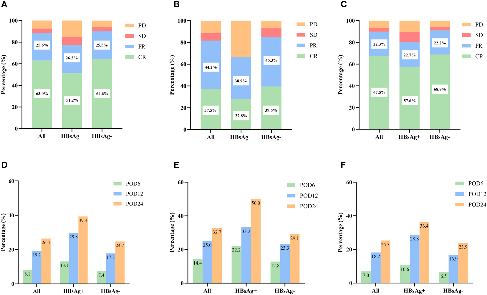 Figure 2 Short-term outcomes in HBsAg-positive and HBsAg-negative DLBCL patients. (A) Treatment response of HBsAg-positive and HBsAg-negative DLBCL patients. (B) Treatment response of HBsAg-positive and HBsAg-negative DLBCL patients treated with CHOP regimen. (C) Treatment response of HBsAg-positive and HBsAg-negative DLBCL patients treated with R-CHOP regimen. (D) Early progression of HBsAg-positive and HBsAg-negative DLBCL patients. (E) Early progression of HBsAg-positive and HBsAg-negative DLBCL patients treated with CHOP regimen. (F) Early progression of HBsAg-positive and HBsAg-negative DLBCL patients treated with R-CHOP regimen.