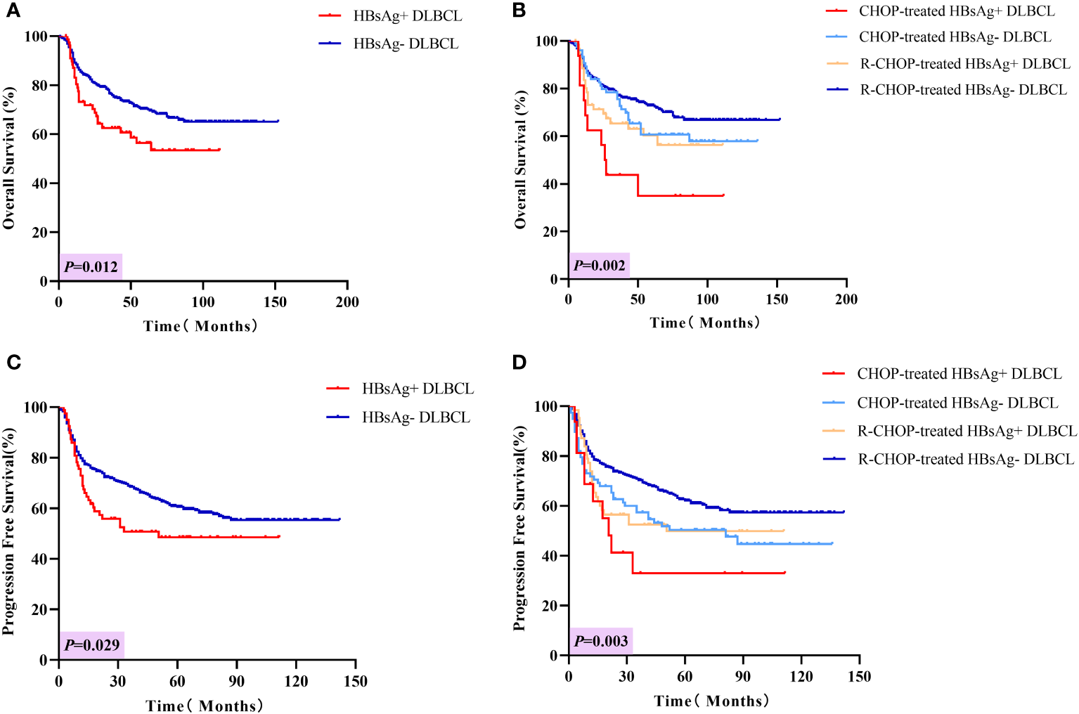 Conclusion: These findings suggest that HBsAg-positive DLBCL patients may represent a distinct subgroup with a poorer prognosis. The standard therapies may be insufficient and new therapeutic strategies should be developed based on a better understanding of the underlying mechanisms of chemoresistance.