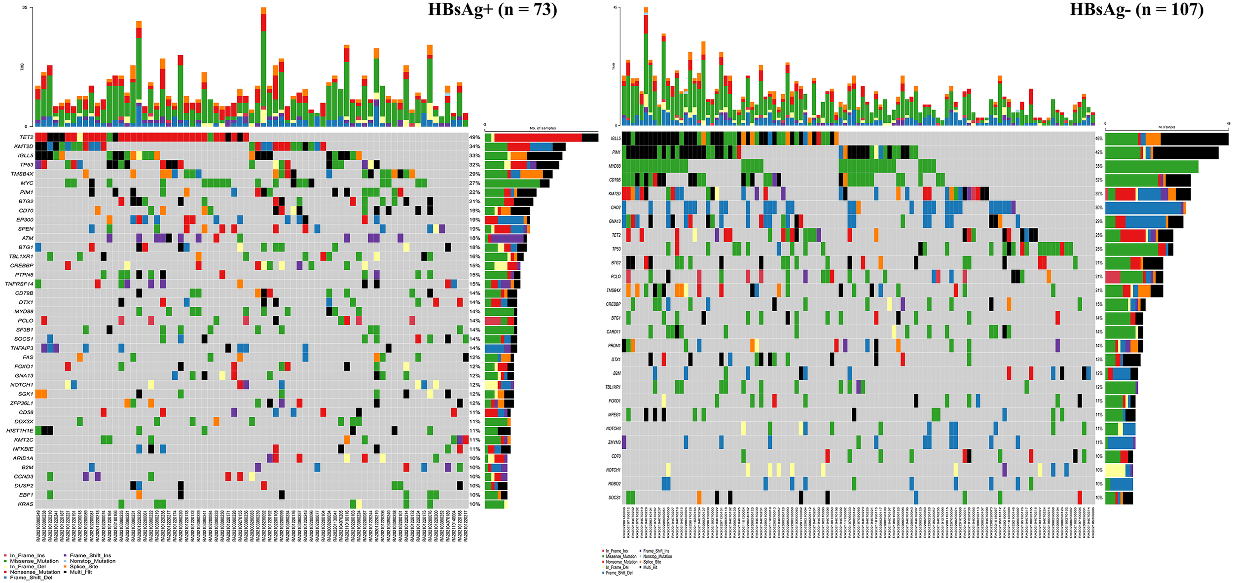 There were 73 HBsAg-positive and 107 HBsAg-negative cases with DLBCL. All patients had at least one mutated gene. As presented in Figure 4, in the HBsAg-positive group, the most frequently mutated (≥15%) genes were TET2, KMT2D, IGLL5, TP53, TMSB4X, MYC, PIM1, BTG2, CD70, EP300, SPEN, ATM, BTG1, TBL1XR1, CREBBP, PTPN6, and TNFRSF14. Thirteen genes were confirmed to be frequently mutated (≥15%) in the HBsAg-negative group, including IGLL5, PIM1, MYD88, CD79B, KMT2D, CHD2, GNA13, TET2, TP53, BTG2, PCLO, TMSB4X, and CREBBP.