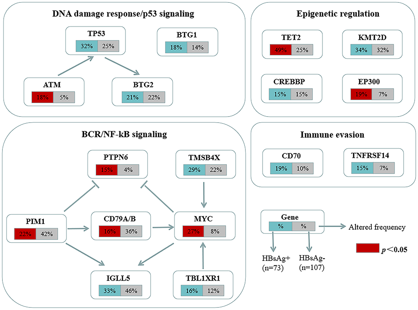 The mutation profiles in HBsAg-positive and HBsAg-negative DLBCL were subsequently compared. First, seven genes had a higher mutation frequency in the HBsAg-positive group than in the HBsAg-negative group, including TET2, MYC, SPEN, SF3B1, ATM, EP300, and PTPN6. Second, some mutation targets in DLBCL, such as CHD2, MYD88, PIM1, CD79B, and GNA13 were less frequently mutated in the HBsAg-positive group (Figure 5). There is a high-frequency set of mutated genes in HBsAg-positive DLBCLs that may affect multiple key pathways involved in lymphoma development, such as epigenetic regulation, DNA damage repair, BCR/NF-kB, and immune evasion (Figure 6).