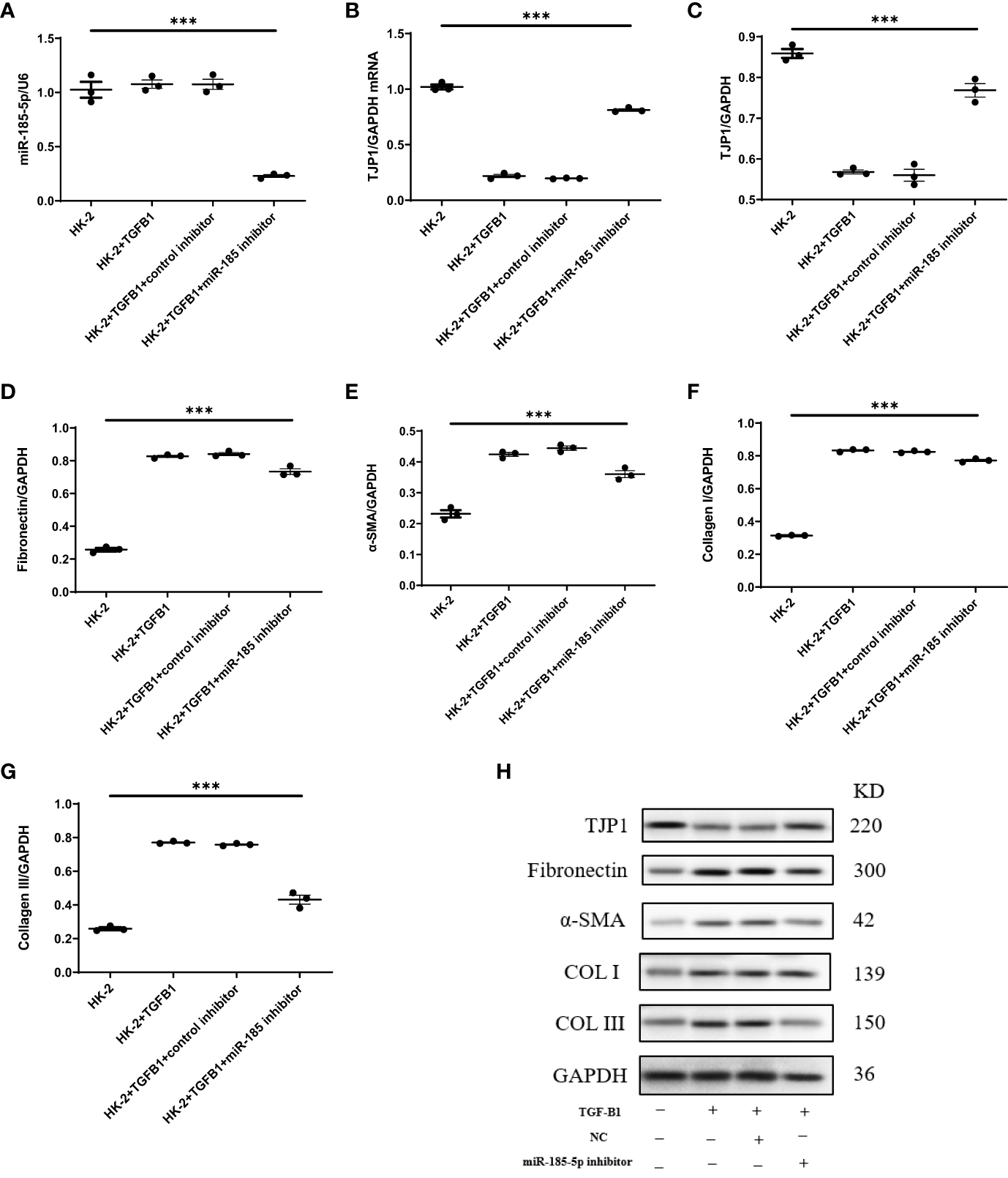 Upregulation of miR-185-5p can promote the expression of fibrotic phenotype-related proteins in HK-2 cells. (A) miR-185-5p expression in HK-2 by RT-PCR. (B) mRNA expression of TJP1 in HK-2 by RT-PCR. (C) Quantification of TJP1 by western blotting in HK-2. (D) Quantification of Fibronectin by western blotting in HK-2. (E) Quantification of α-SMA by western blotting in HK-2. (F) Quantification of Collagen I by western blotting in HK-2. (G) Quantification of Collagen III by western blotting in HK-2. (H) Representative western blotting of these protein (TJP1, Fibronectin, α-SMA, Collagen I, and Collagen III). ***P (vs. normal control HK-2 group)<0.001.