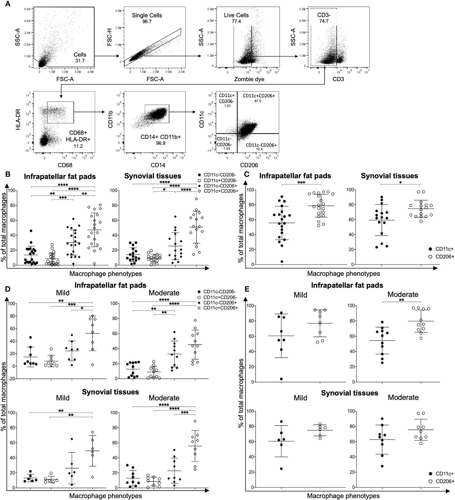 Figure 1 Characterization of macrophage phenotypes in the infrapatellar fat pads (IPFPs) and synovial tissues of patients with knee osteoarthritis (OA). (A) Representative gating strategy for the identification of macrophage phenotypes in IPFPs and synovial tissues. Macrophage populations were gated on live CD3-CD68+HLA-DR+CD14+CD11b+ and subsequently gated on CD11C-CD206-, CD11C+CD206-, CD11C-CD206+, and CD11C+CD206+ cells, respectively. (B, C) Comparison of macrophage phenotypes in the IPFPs (n = 20) and synovial tissues (n = 16) obtained from OA patients. (D, E) Comparison of macrophage phenotypes in IPFPs and synovial tissues of OA patients with mild (IPFPs; n = 8, synovial tissues; n = 6) and moderate (IPFPs; n = 11, synovial tissues; n = 9) OA severity. The differences of CD11c-CD206-, CD11c+CD206-, CD11c-CD206+, and CD11c+CD206+ macrophage frequencies were calculated using one-way ANOVA, and the differences of CD11c+ and CD206+ macrophages were calculated using Mann–Whitney U-test analysis (*p < 0.05; **p < 0.01; ***p ≤ 0.001; ****p ≤ 0.0001).