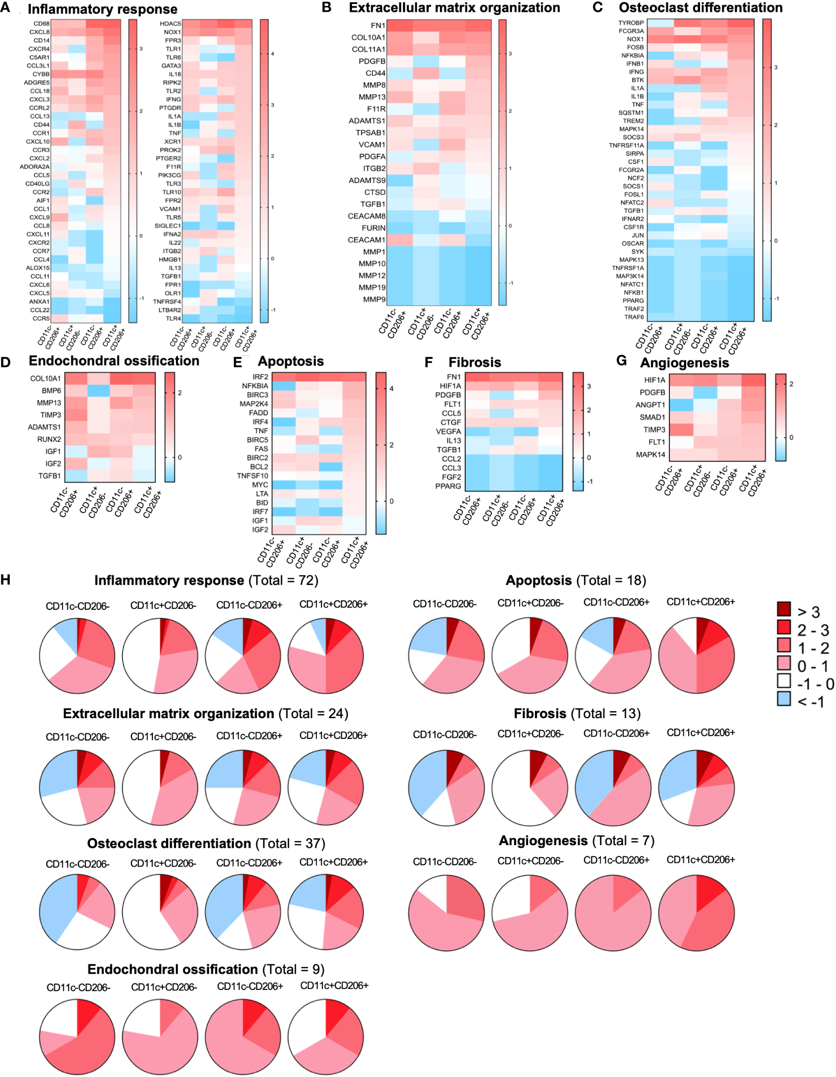 Figure 4 Gene expression profiles of macrophages isolated from the infrapatellar fat pads of osteoarthritis (OA) patients that are involved with OA pathogenesis. Heatmap illustrating the differential expression of genes associated with (A) the inflammatory response (GO:0006954), (B) extracellular matrix organization (R-HSA-1474244), (C) osteoclast differentiation, (D) endochondral ossification, (E) apoptosis, (F) fibrosis, and (G) angiogenesis in CD11c-CD206- (n = 3), CD11c+CD206- (n = 3), CD11c-CD206+ (n = 3), and CD11c+CD206+ (n = 3) macrophages as the log2 fold change of normalized data. Differential gene expressions are displayed as colors ranging from red to blue. (H) Pie chart representation of genes differentially expressed in CD11c-CD206-, CD11c+CD206-, CD11c-CD206+, and CD11c+CD206+ macrophages according to inflammatory response, extracellular matrix organization, osteoclast differentiation, endochondral ossification, apoptosis, fibrosis, and angiogenesis pathways.