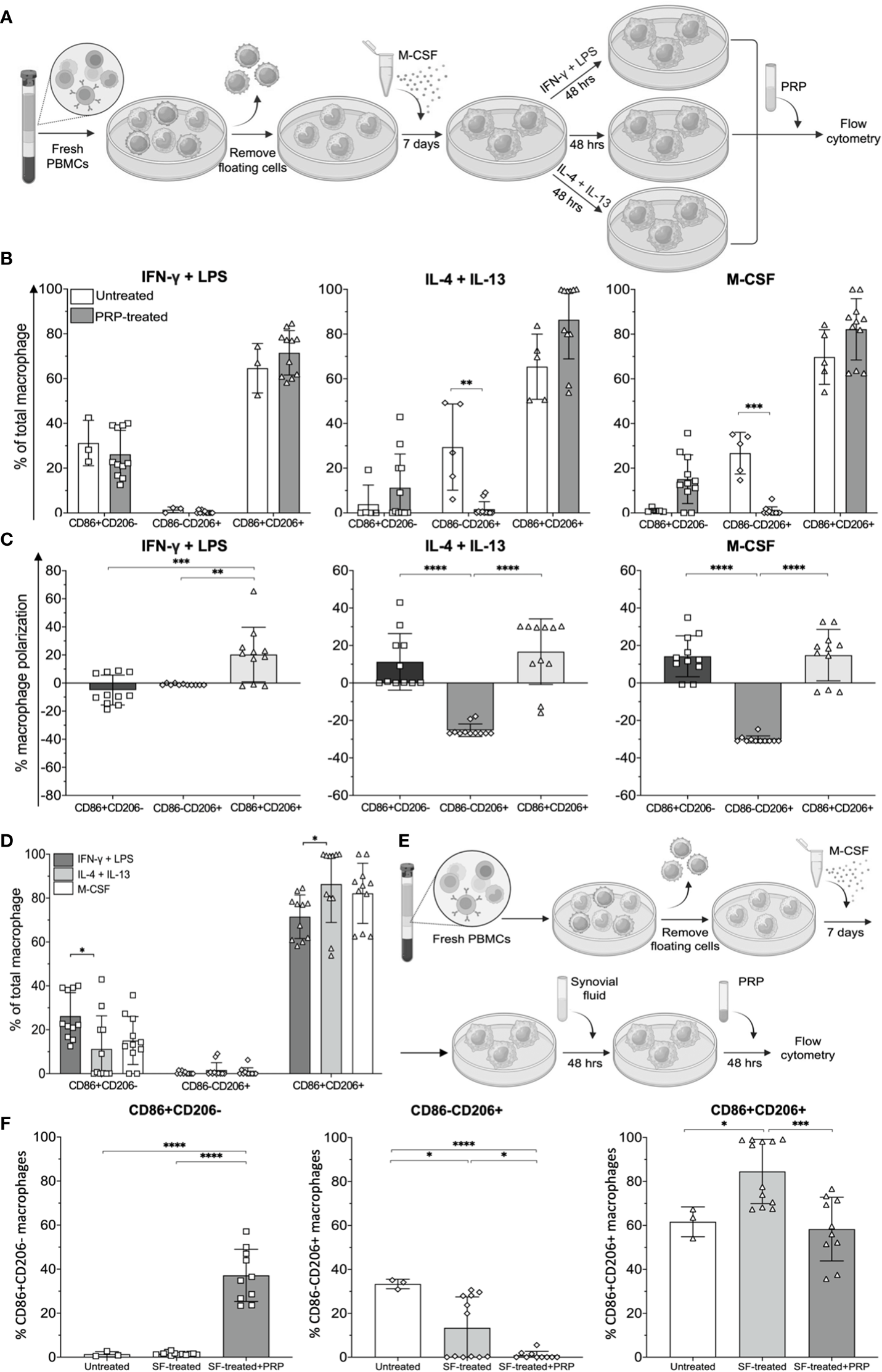 Figure 6 Effects of platelet-rich plasma (PRP) on synovial fluid-treated monocyte-derived macrophages (MDMs). (A) Schematic of MDM polarization simulating CD11c+CD206- (M1), CD11c-CD206+ (M2), and CD11c+CD206+ macrophages using IFNγ and LPS, IL-4 and IL-13, and M-CSF, respectively, and subsequent treatment with PRP. (B) Frequencies and (C) polarization status of MDMs after treatment with PRP at a 1:8 dilution (n = 11). (D) Comparison of macrophage subpopulation frequencies after treatment with PRP (n = 11). (E) Schematic illustrating MDMs receiving treatment with PRP after being exposed to synovial fluid. (F) Comparison of CD86+CD206-, CD86-CD206+, and CD86+CD206+ macrophage frequencies after treatment with synovial fluid only (n = 12) and synovial fluid followed by PRP (n = 10). The differences of CD86-CD206-, CD86+CD206-, CD86-CD206+, and CD86+CD206+ MDM frequencies, polarization status, mean fluorescent intensity, and cell viability were calculated using one-way ANOVA (*p < 0.05; **p < 0.01; ***p ≤ 0.001; ****p ≤ 0.0001).