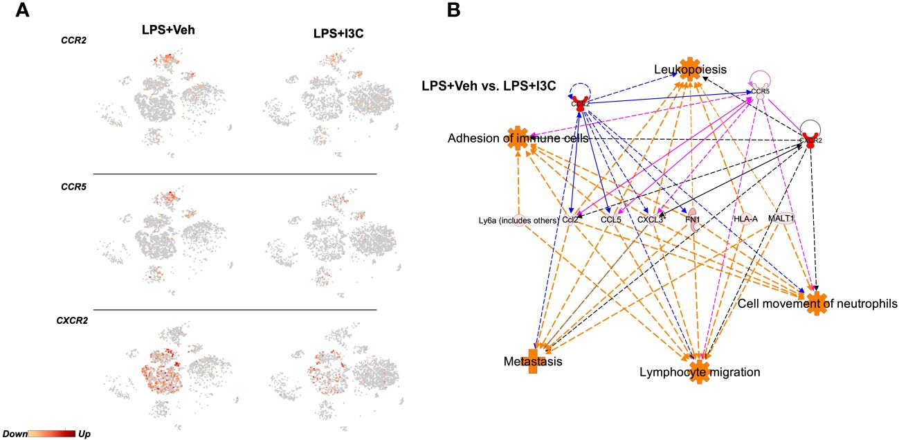 Figure 2 Ingenuity Pathway Analysis prediction of dysregulated chemoattractant ligand genes in LPS-exposed vs LPS+I3C treated mice. Mice were exposed to LPS to induce ARDS followed by treatment with I3C as described in the Methods and cells from the lungs were screened as follows. (A) scRNAseq t-SNE heatmap expression of CCR2, CCR5, and CXCR2. (B) IPA pathway prediction graphical summary of local gene dysregulation associated with immune cell trafficking functions when comparing LPS+Veh vs. LPS+I3C.