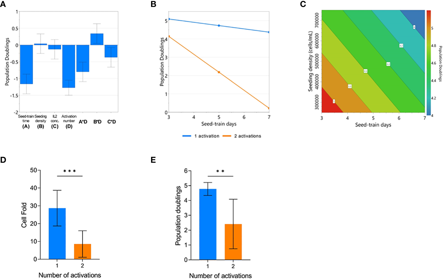 Figure 2 Repeated activation, higher seeding density, and longer seed train time negatively impact CAR-T cell yield. Regression coefficients included in the modelled response for population doublings (PD) on day 7 of G-Rex culture (A). Modelled factor-interaction between seed-train time and number of activations (B). Modelled effects of seeding density and seed-train time on PD, assuming 1 activation and 30 IU/mL of IL2 (C). Effect of number of activations on cell fold (D), and PD (E). Error bars represent standard deviation. Statistical pooled t-test analyses completed where ** is p<0.01, *** is p<0.001.