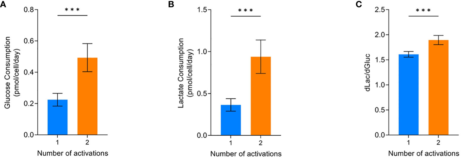 Figure 4 Effect of activations on the average glucose consumption (A), lactate production (B), and dlac/dgluc (C). Error bars represent standard deviation. Statistical pooled t-test analyses completed where *** is p<0.001. Dashed lines represent the confidence interval of the model. All model graphs shown represent the model when IL-2 = 30 IU/mL and seeding density = 2.5x106 cells/cm2.