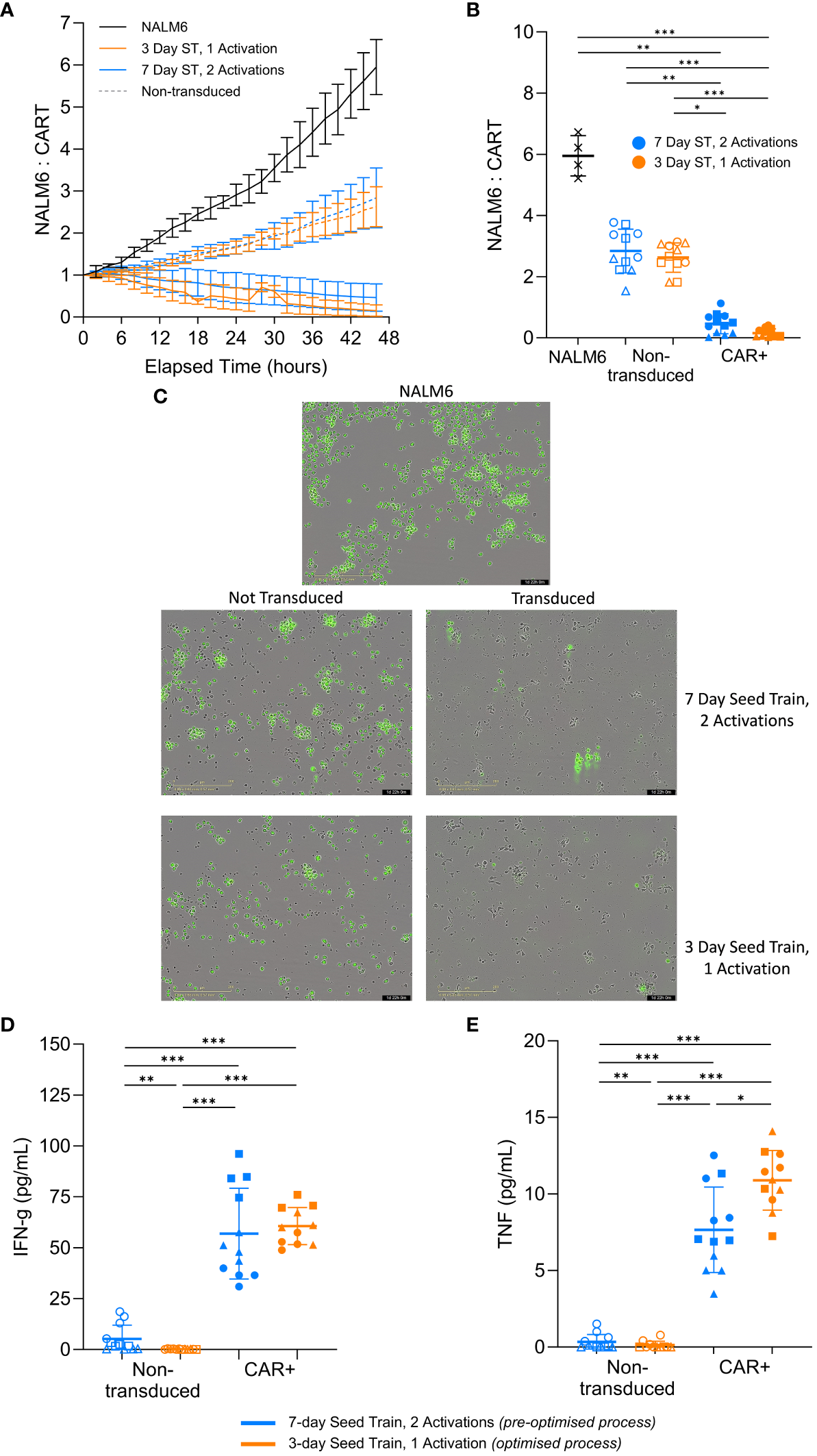Figure 6 CAR-T cells effectively kill target cells and secrete cytokines post-expansion. Following expansion in flasks, cells were co-cultured with target GFP-positive NALM6 cells. Relative number of NALM6 cells during the 2-day co-culture (A). Final relative number of NALM6 cells (B) and representative images of each culture type (20X magnification) (C) at the end of the 2-day co-culture. Cytokine levels in the medium for IFN-γ (D) and TNF-α (E) at the end of the 2-day killing assay co-culture. Each condition completed in quadruplicate (n=4). Points represent each donor (square = HD1, triangle = HD2, circle = HD3). Error bars represent standard deviation. One-way ANOVA and Dunn’s test completed where * is p<0.05, ** is p<0.01, *** is p<0.001.