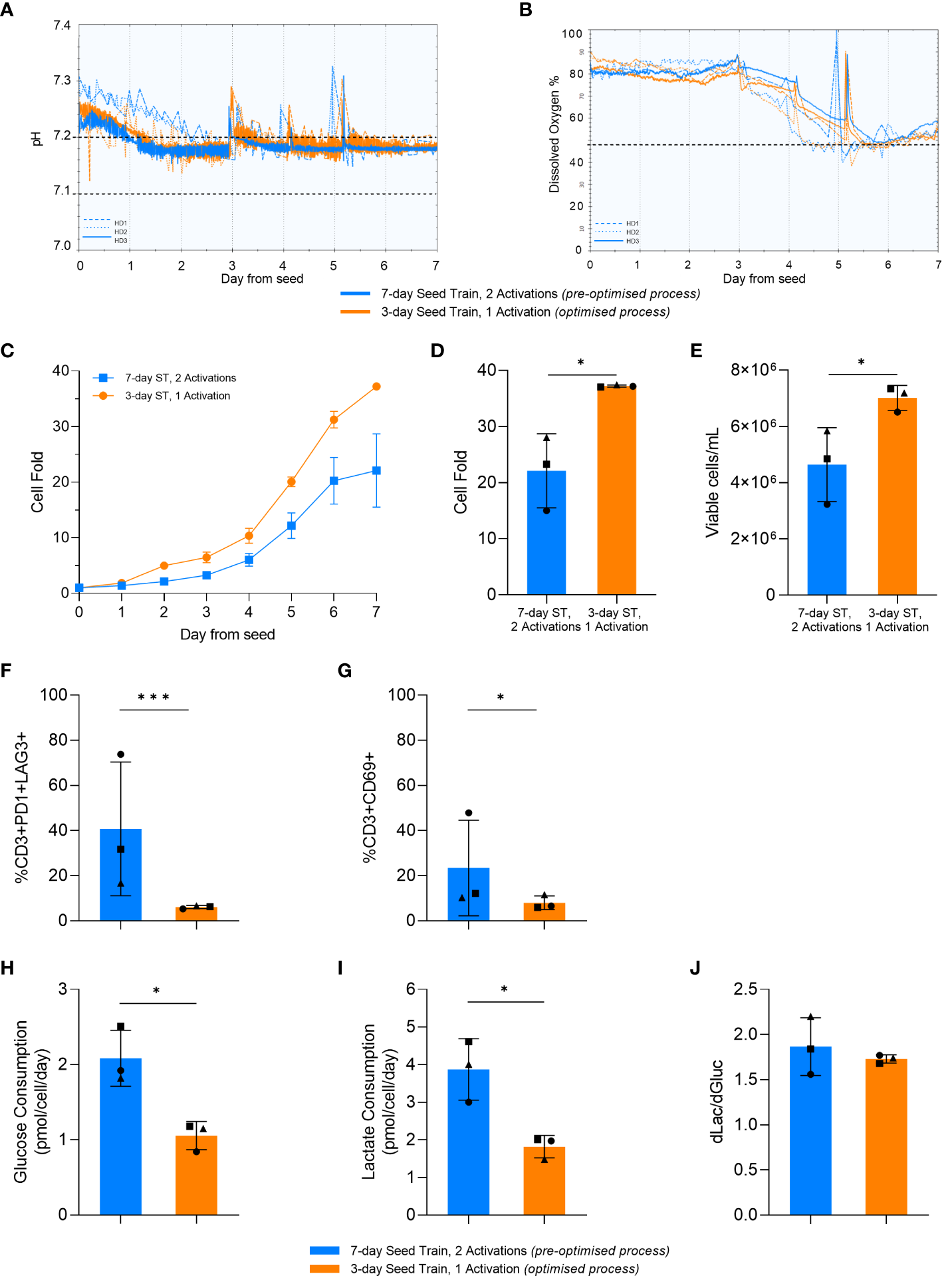 Figure 7 Optimised process increased cell expansion in the stirred-tank bioreactor (STR). pH (A) and dissolved oxygen (DO) (B) over time in the STR cultures. Dashed lines represent HD1, dotted lines represent HD2, and solid lines represent HD3. Horizontal black dashed lines represent the parameter setpoints. Cell fold by day in the STR (C). Cell fold (D), cell density (E), T-cell exhaustion (F) and activation (G) on day 7 of STR culture. Average glucose consumption (H), lactate production (I), and change in lactate divided by change in glucose (dLac/dGluc) (J). Day 0 represents the day STRs were seeded post seed train (ST). Points represent each donor (square = HD1, triangle = HD2, circle = HD3). Error bars represent standard deviation. Statistical pooled t-test analyses completed where * is p<0.05, *** is p<0.001.