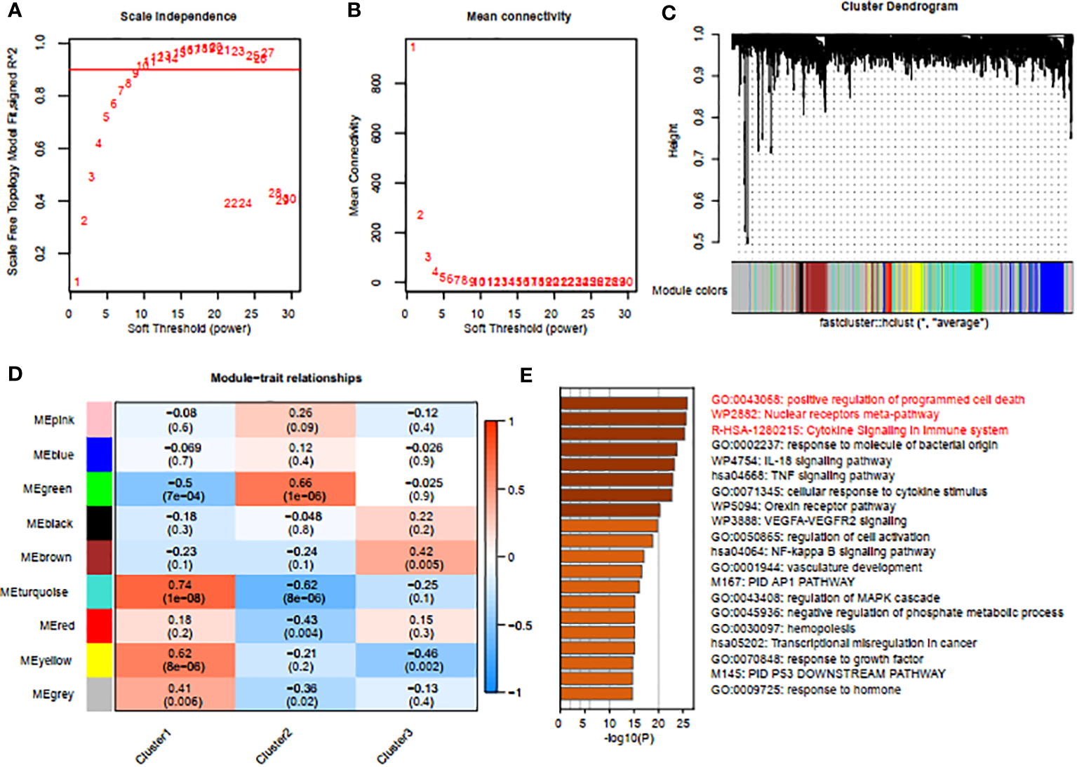Screening of gene modules and construction of co-expression networks. (A, B) Analysis of network topologies for various soft-thresholding powers through the scale-free fit index (A) and mean connectivity (B). (C) Cluster tree dendrogram of co-expression modules. (D) Correlation analysis between module eigengenes and clinical status. Each row represents a module; each column represents a clinical status. (E) Enrichment analysis using Metascape for genes in the blue module.