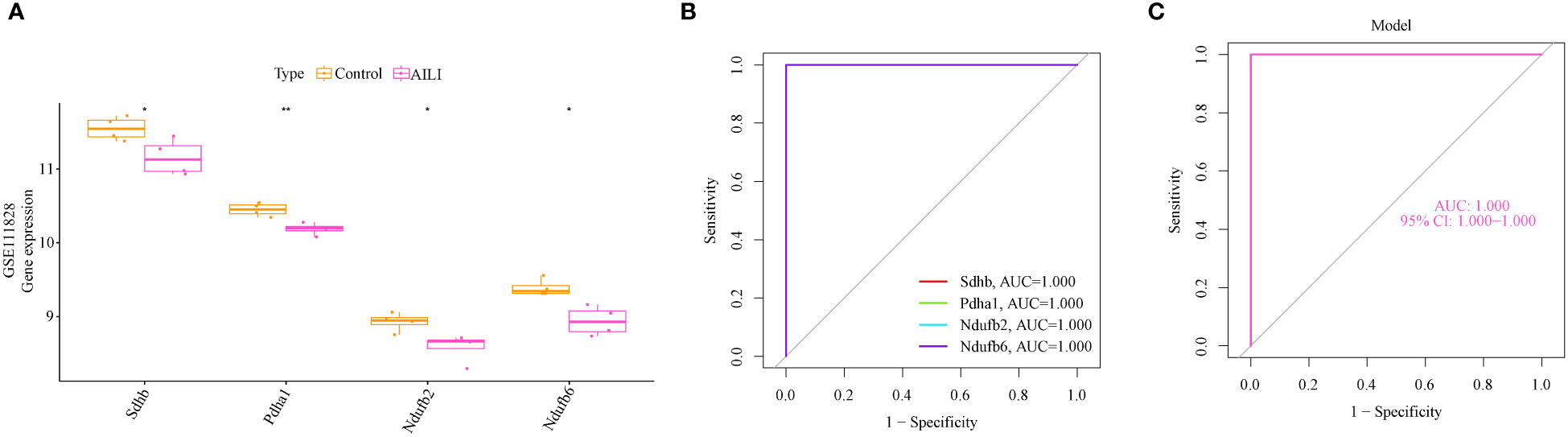 Validation of the OFGs in the GSE111828 dataset. (A) Boxplots indicating that the four OFGs were significantly altered between the AILI and control samples (B) ROC curves of the four OFGs in the GSE111828 dataset. (C) ROC curve analysis of the four-OFG-based model in the GSE111828 dataset. P values are shown as * p < 0.05 and ** p < 0.01. OFGs, optimal feature genes; ROC, receiver operating characteristic.