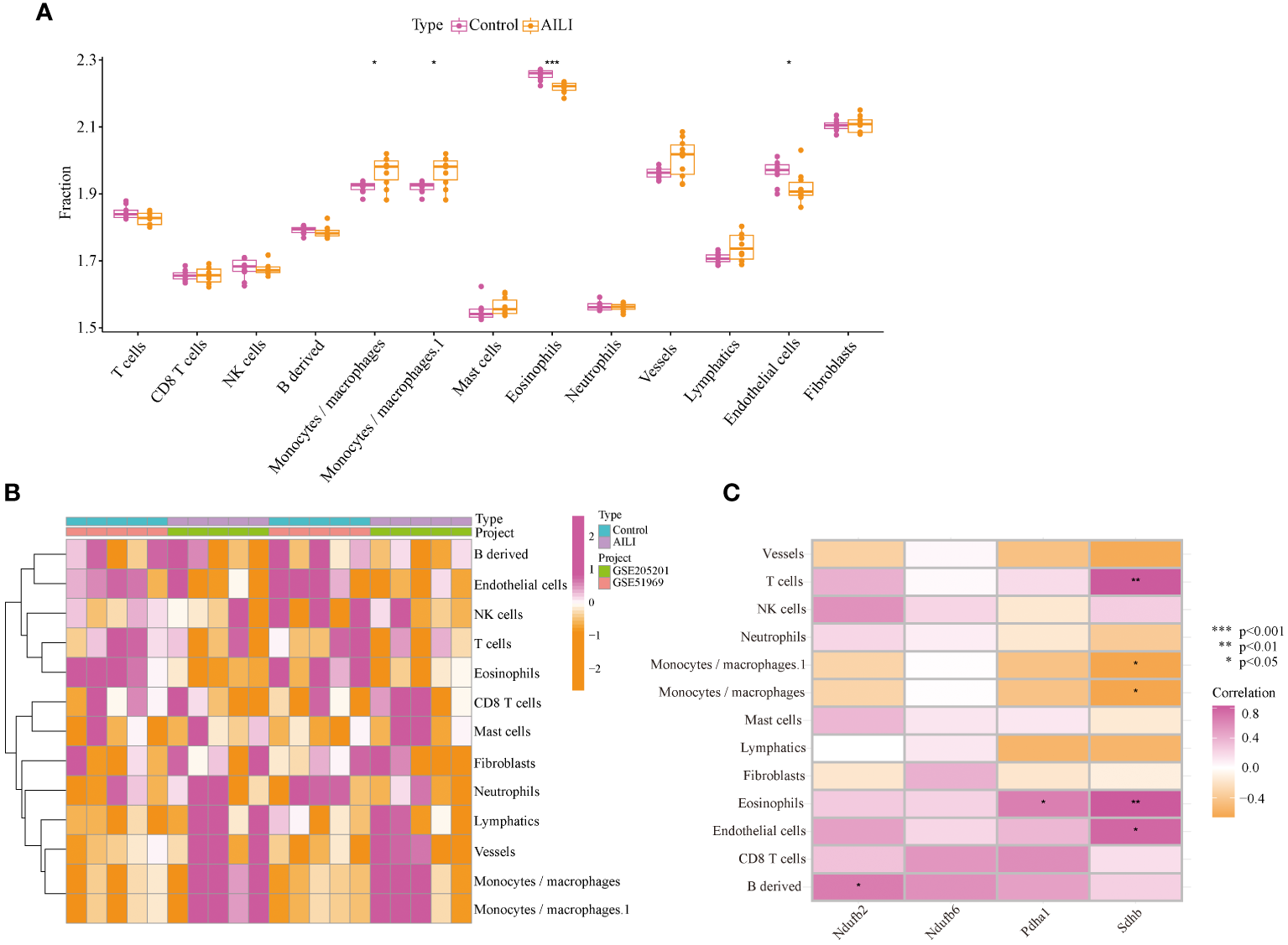 Immune infiltration analysis of the AILI and control samples. (A) Box plots showing the differences in immune infiltration between the AILI and control samples. (B) Heatmap of immune cells. (C) Correlation analysis between the OFGs and immune cells. P values are shown as * p < 0.05, ** p < 0.01, and *** p < 0.001. AILI, acetaminophen induced liver injury; OFGs, optimal feature genes.