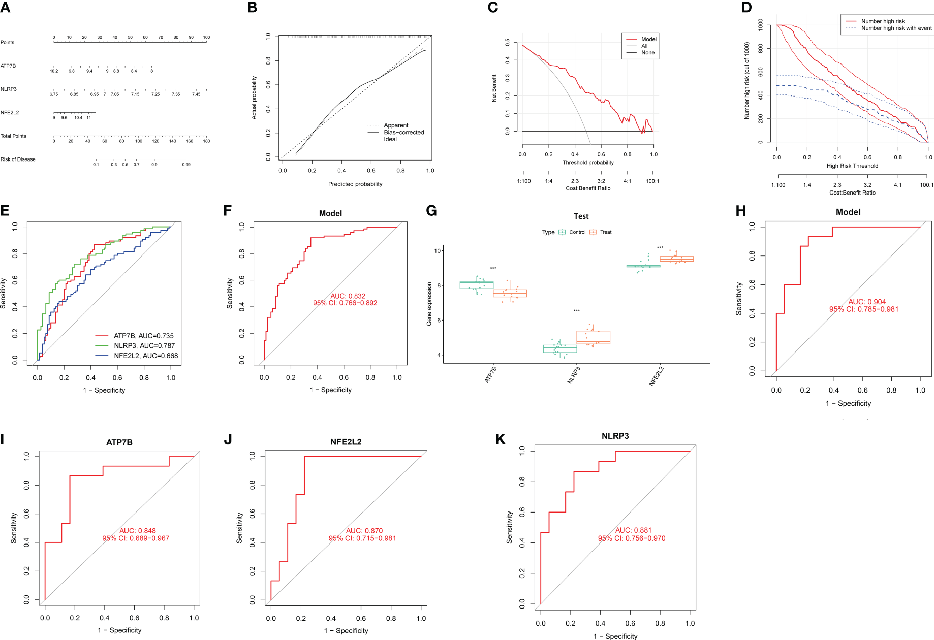 Confirmation of marker gene expression. (A) Nomogram graph of the three marker genes. (B) Calibration plot showing the diagnostic accuracy of the nomogram model. (C) DCA demonstrates the predictive performance of nomogram models. (D) The clinical impact curve demonstrates a superior diagnostic capability of the nomogram model. (E) The ROC outcomes for the three marker genes. The AUC values for ATP7B, NLRP3, and NFE2L2 were 0.735, 0.787, and 0.668, respectively. (F) ROC results of the three-gene-based model based on three-fold cross-validation. The AUC value is 0.832. (G) Boxplots demonstrate significant alterations in the expression of three specific differentially expressed CRGs between the HIRI and control samples in the dataset GSE15480 and GSE228782. (H) The AUC value of ROC curves for all three hub genes together in GSE15480 and GSE228782. (I) The AUC value of the ROC curves for ATP7B. (J) The AUC value of the ROC curves for NFE2L2 (K) The AUC value of the ROC curves for NLRP3. AUC, area under the curve; DCA, decision curve analysis; and ROC, receiver operating characteristic. ***, p < 0.001.
