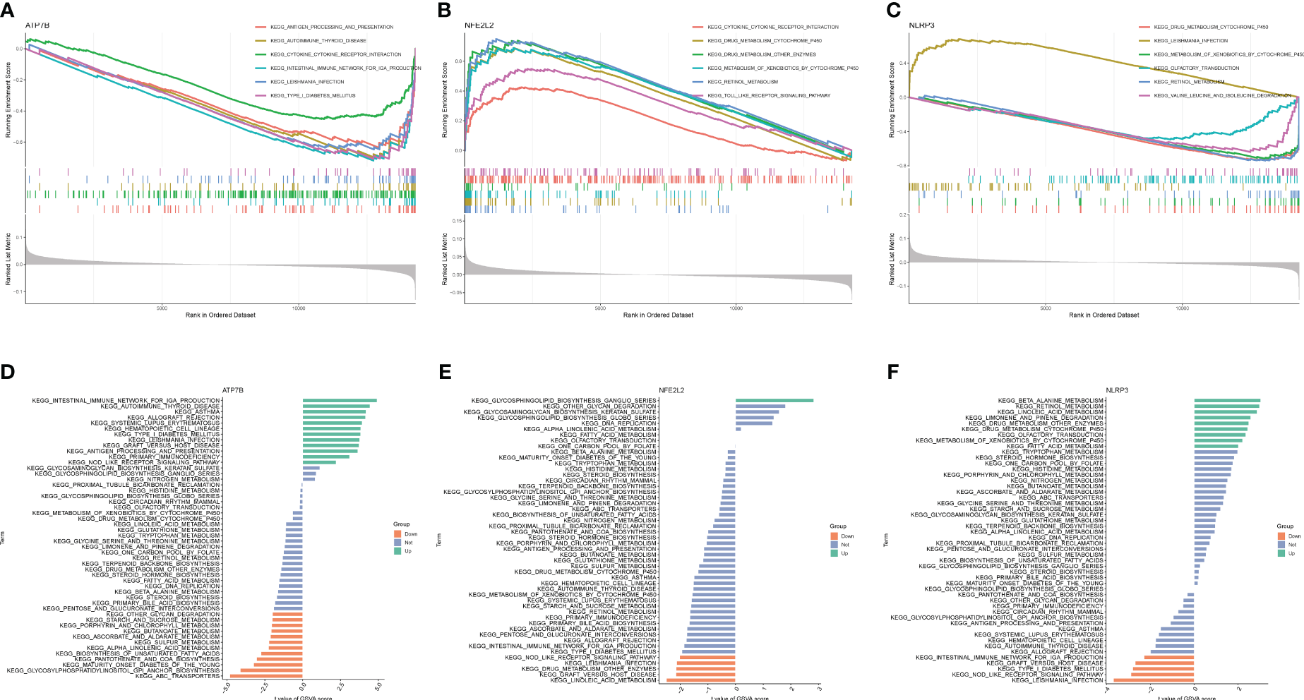 GSEA and GSVA of three marker genes. The GSEA enrichment method was used to conduct KEGG pathway enrichment analyses for (A) ATP7B, (B) NFE2L2, and (C) NLRP3. The visualization is based on the arrangement of enrichment scores, highlighting the two items with the highest and lowest enrichment scores. The visualization highlights the items with the highest and lowest enrichment scores, based on the arrangement of enrichment scores. The KEGG pathway enrichment analyses of (D) ATP7B, (E) NFE2L2 and (F) NLRP3 were performed using the GSVA enrichment method, and the enrichment scores were used to visualize the top 50 pathways.