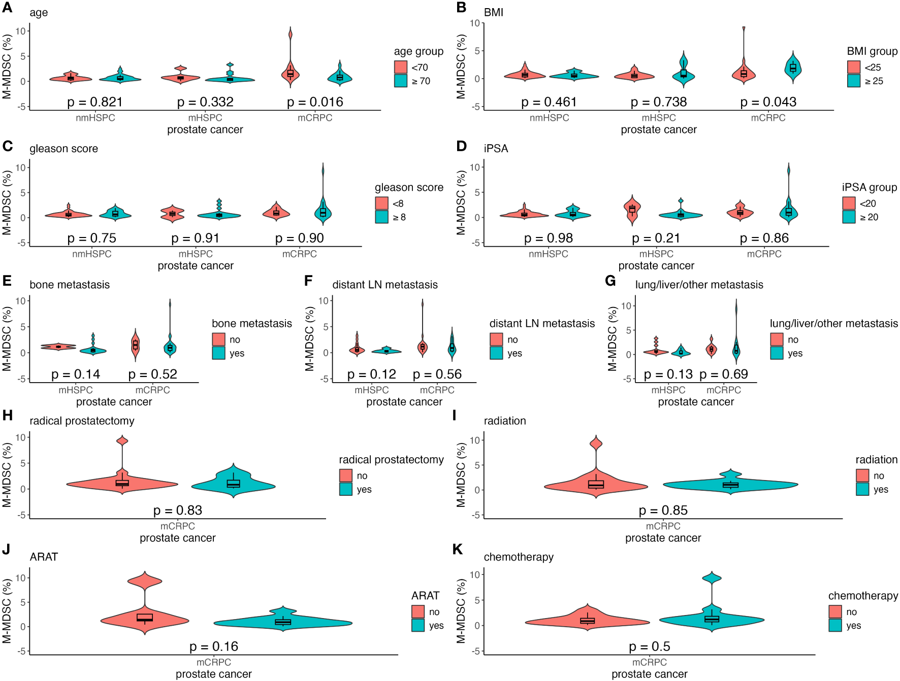 Violin and box plots of the percentage of M-MDSC by each factor in prostate cancer. (A) Age. (B) BMI. (C) Gleason score. (D) iPSA. (E) Bone metastases. (F) Distant lymph node metastases. (G) Lung/liver/other metastases. (H) Previous radical prostatectomy. (I) Previous radiation therapy. (J) Previous ARAT treatment. (K) Previous chemotherapy treatment. The x-axis indicates the comparison of prostate cancer disease status in the three groups, whereas the y-axis indicates the percentage of MDSCs in PBMCs. Differences were considered significant when p <0.05 within the respective figures. LN, lymph node; mCRPC, metastatic castration-resistant prostate cancer; mHSPC, metastatic hormone-sensitive prostate cancer; nmHSPC, non-metastatic hormone-sensitive prostate cancer; M-MDSC, monocytic myeloid-derived suppressor cell; PBMC, peripheral blood mononuclear cell.