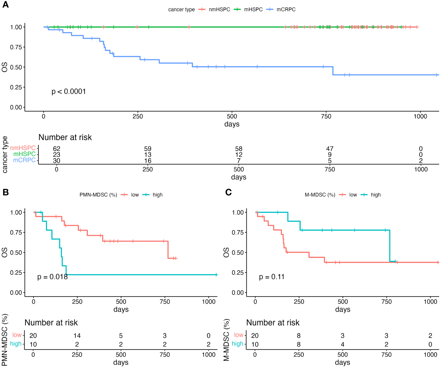 Kaplan–Meier curve of overall survival. (A) Comparison of the survival in each of the prostate cancer pathologies. Only survivors were observed in nmHSPC and mHSPC. (B) Comparison of the survival among mCRPC patients stratified by the level of PMN-MDSC. (C) Comparison of the survival among mCRPC patients stratified by the level of M-MDSC. Statistical significance of the survival distribution was analyzed by log-rank testing. mCRPC, metastatic castration-resistant prostate cancer; mHSPC, metastatic hormone-sensitive prostate cancer; nmHSPC, non-metastatic hormone-sensitive prostate cancer; PMN-MDSC, polymorphonuclear myeloid-derived suppressor cell; OS, overall survival.