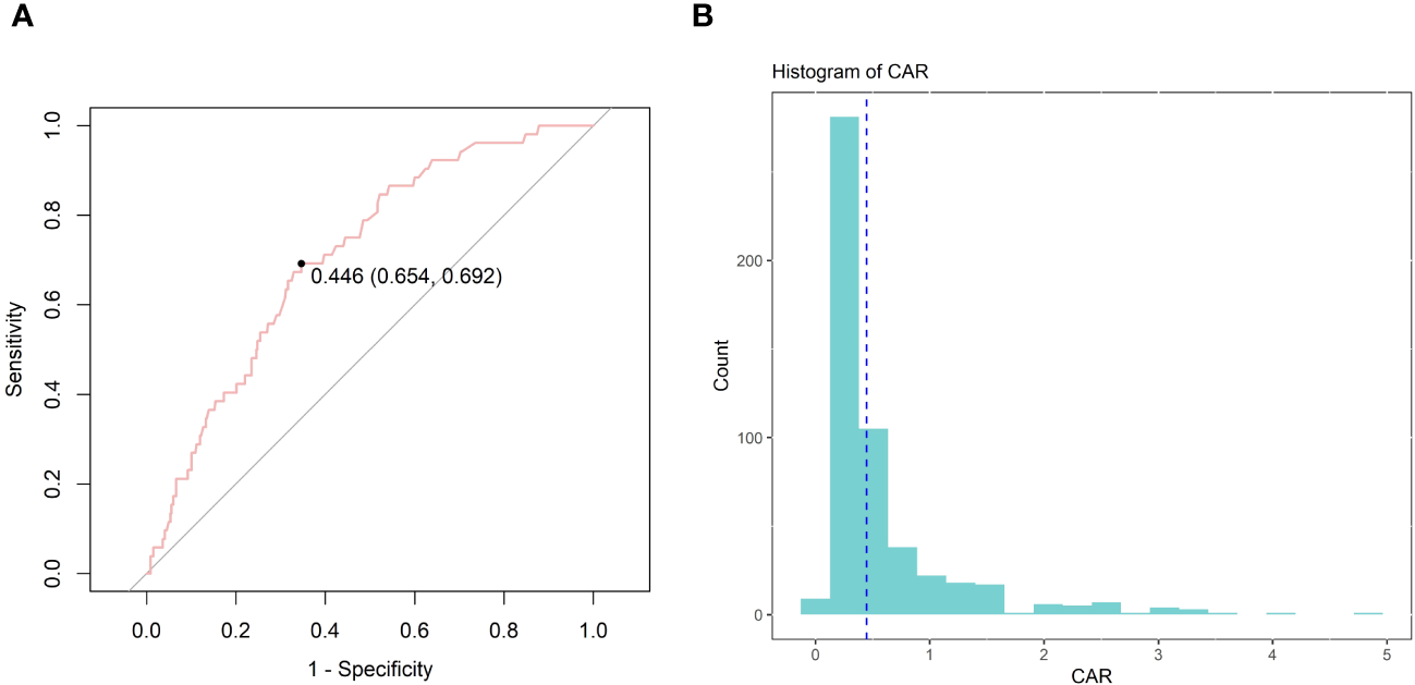 The choice of the optimal cutoff point maximized the risk ratio (A) and the relationship between CAR≥0.446 and the distribution of CAR (B).