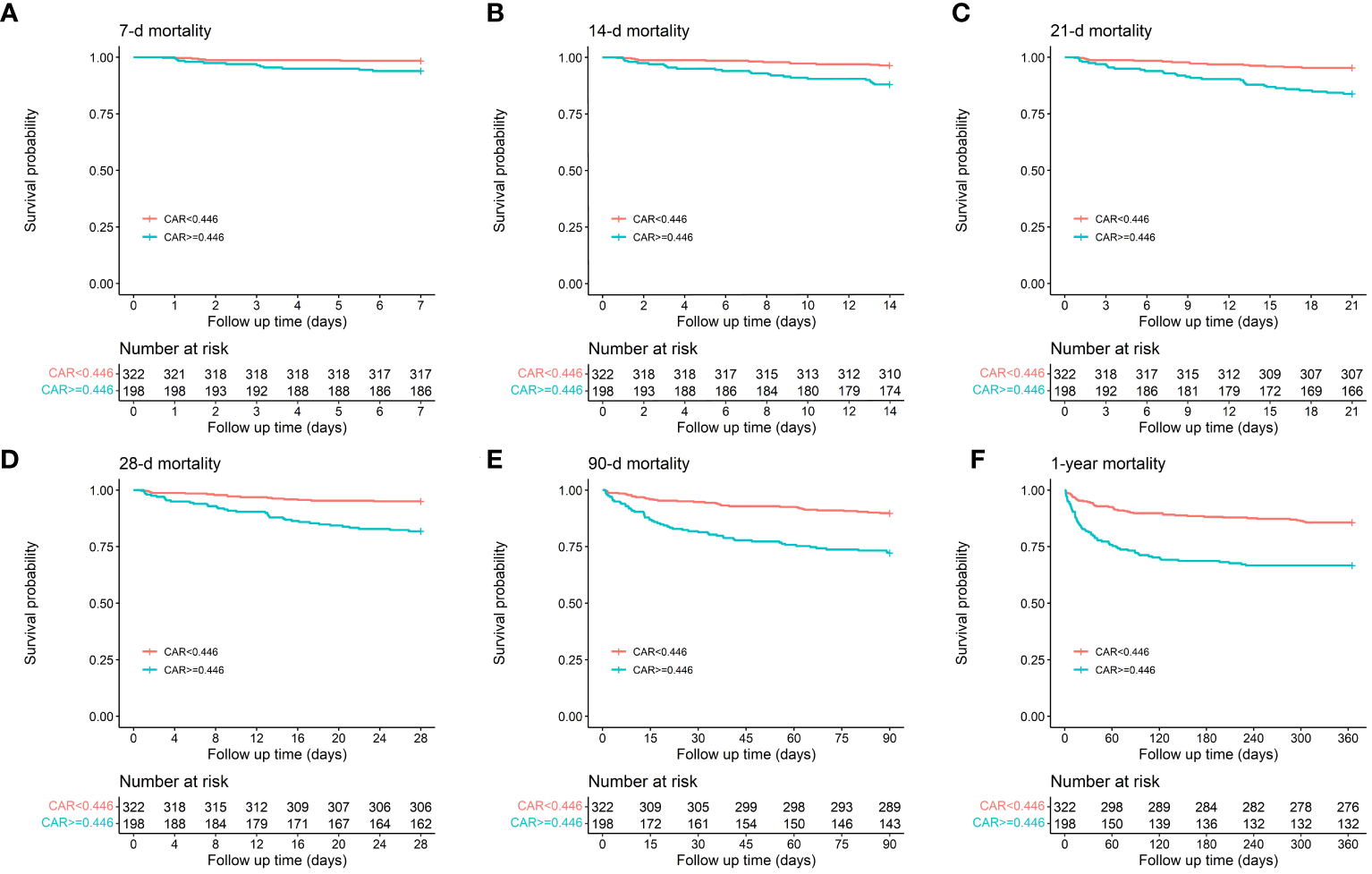 Ultimately, 520 patients with AP receiving treatment in the ICU were included in this study (Figure 1). Notably, 231 (44.4%) were women, and 289 were men (55.6%). Using X-tile software, the best CAR cutoff was determined based on whether the patient died on day 28 following admission. The results showed that 0.446 was the ideal CAR threshold (Figure 2). The study population was divided into two groups: those with a low CAR (<0.446) and those with a high CAR (≥ 0.446) and those with the high CAR group had lower mean arterial pressure, systolic and diastolic blood pressure, and body temperature, and greater rates of vasopressin and continuous renal replacement therapy. In addition, patients with a combination of AKI, sepsis, and respiratory failure (RF) were more likely to be in the high CAR group. Among the laboratory markers, patients in the high CAR group had elevated levels of lactate, anion gap, serum potassium, international normalized ratio, blood urea nitrogen, prothrombin time, and creatinine. Subsequent research revealed a greater risk of poor prognosis for patients in the high CAR group. They had higher ICU mortality (4.0% vs. 13.1%, P < 0.001), hospitalization mortality (6.2% vs. 19.2%, P < 0.001), 7-d mortality (1.6% vs. 6.1%, P = 0.011), 14-d mortality (3.7% vs. 12.1%, P < 0.001), 21-d mortality (4.7% vs. 16.2%, P < 0.001), 28-d mortality (5.0% vs. 18.2%, P < 0.001), 90-d mortality (10.2% vs. 27.8%, P < 0.001) and 1-y mortality (14.3% vs. 33.3%, P < 0.001). Furthermore, the high CAR group had longer ICU hospitalizations [(3.18 (1.86, 6.66) vs. 5.84 (2.37, 13.16), P < 0.001)] and longer hospital stays overall [11.33 (6.96, 21.34) vs. 16.71 (9.90, 28.76), P < 0.001)]. The detailed results are presented in Table 2.