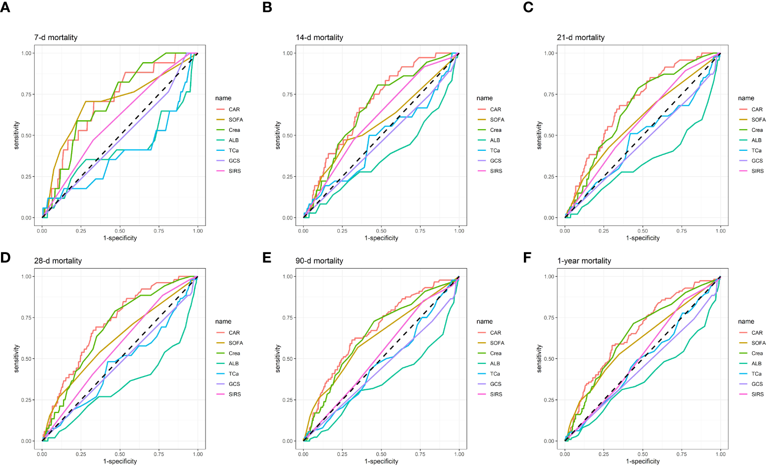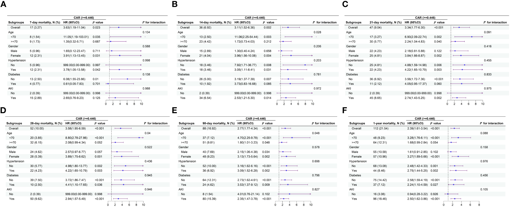 A total of 520 participants were included in this study. The CAR ideal threshold, determined by X-tile software, was 0.446. The Cox proportional hazards model revealed an independent association between CAR≥0.446 and all-cause mortality at 7-day (d), 14-d, 21-d, 28-d, 90-d, and 1-year (y) before and after adjustment for confounders. K-M survival curves showed that patients with CAR≥0.446 had lower survival rates at 7-d, 14-d, 21-d, 28-d, 90-d, and 1-y. Additionally, CAR demonstrated superior performance, with higher AUC values than Cr, Alb, serum total calcium, Glasgow Coma Scale, Systemic Inflammatory Response Syndrome score, and Sepsis-related Organ Failure Assessment score at 7-d, 14-d, 21-d, 28-d, 90-d, and 1-y intervals. Subgroup analyses showed that CAR did not interact with a majority of subgroups.