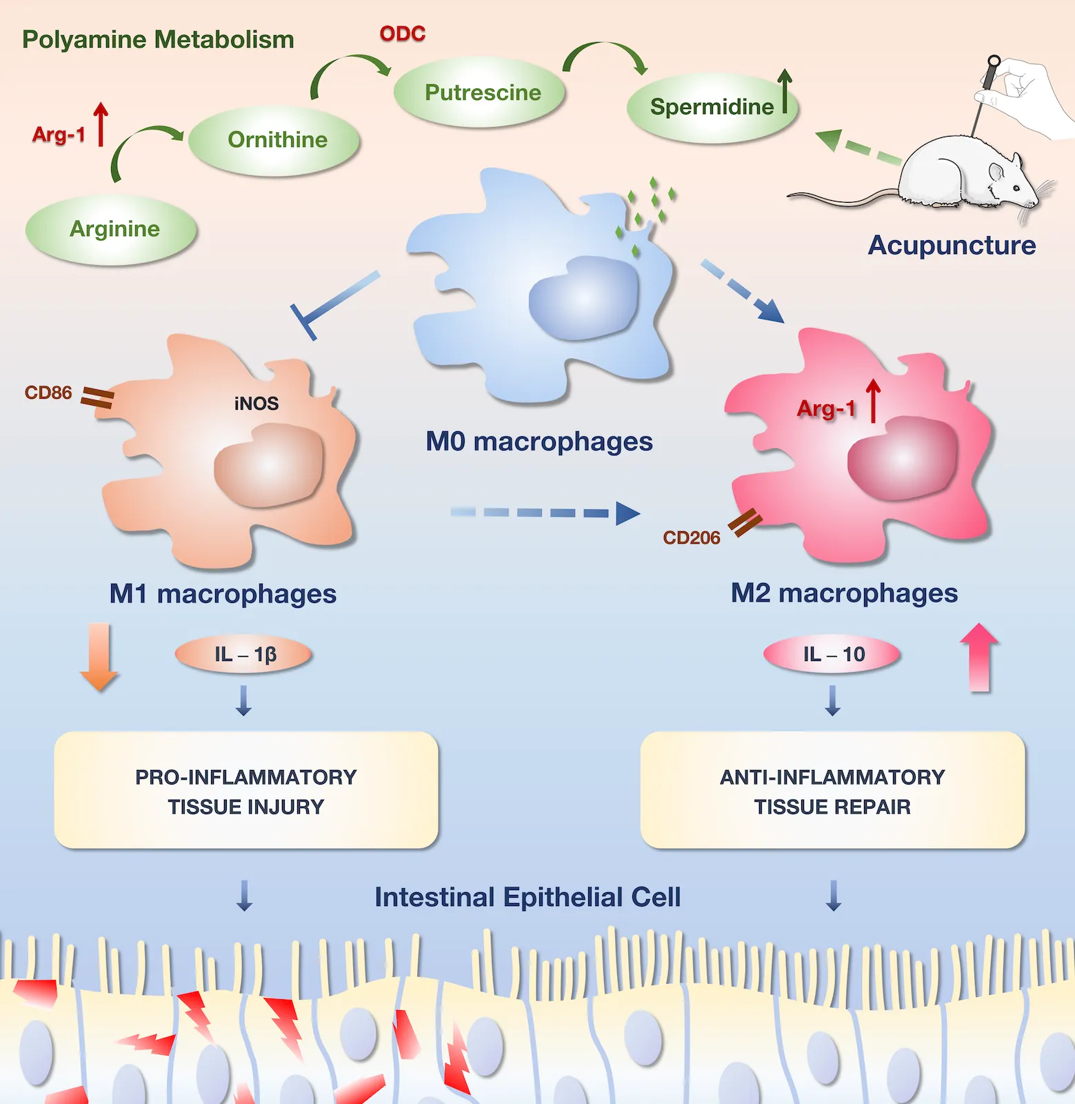 In summary, this study established a polyamine depletion model and confirmed that the mechanism by which EA alleviates intestinal injury associated with CLP-induced sepsis is through promoting M2 macrophage polarization mediated by spermidine expression. This polarization inhibits the expression of inflammatory factors and promotes intestinal repair. However, polyamines, as guardians of the gastrointestinal tract, are derived from both endogenous intracellular amino acid metabolism and exogenous intestinal microbial metabolism. In future studies, further clarification of the endogenous and exogenous mechanisms by which acupuncture regulates polyamine metabolism and its relationship with intestinal immunity will be explored.