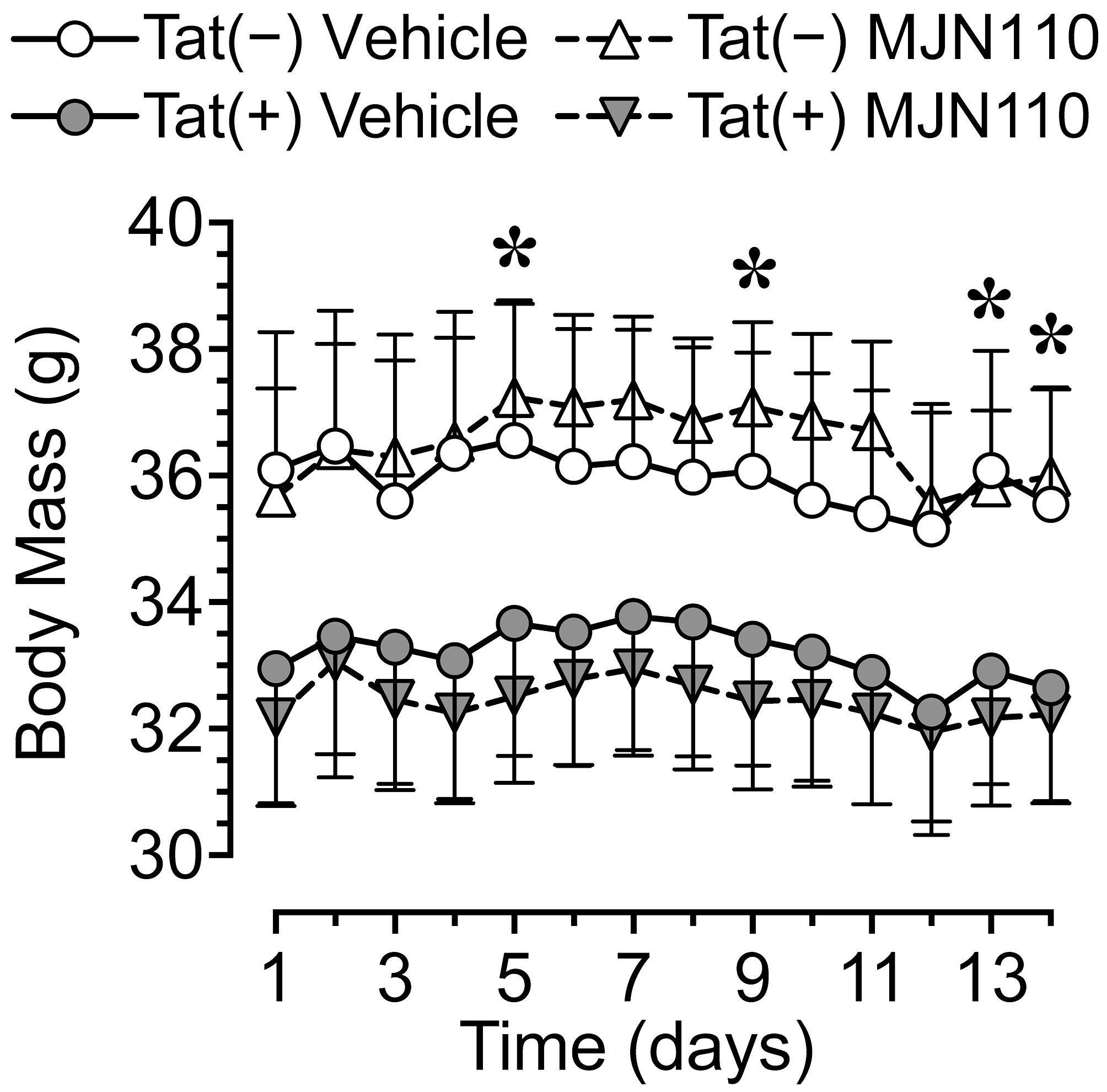 Body mass data for the two weeks of MJN110/vehicle injections prior to the start of behavioral assessment. Tat expression showed a trend for decreased body mass (g) over the two-week period, with lower body mass for Tat(+) mice compared to Tat(−) mice on days 5, 9, 13, and 14. Follow-up Tukey’s post hoc test demonstrated no significant group differences. No effects were noted for MJN110 treatment. All data are expressed as mean ± the standard error of the mean (SEM). Statistical significance was assessed by ANOVAs followed by Tukey’s post hoc tests when appropriate; *p < 0.05 main effect of genotype.