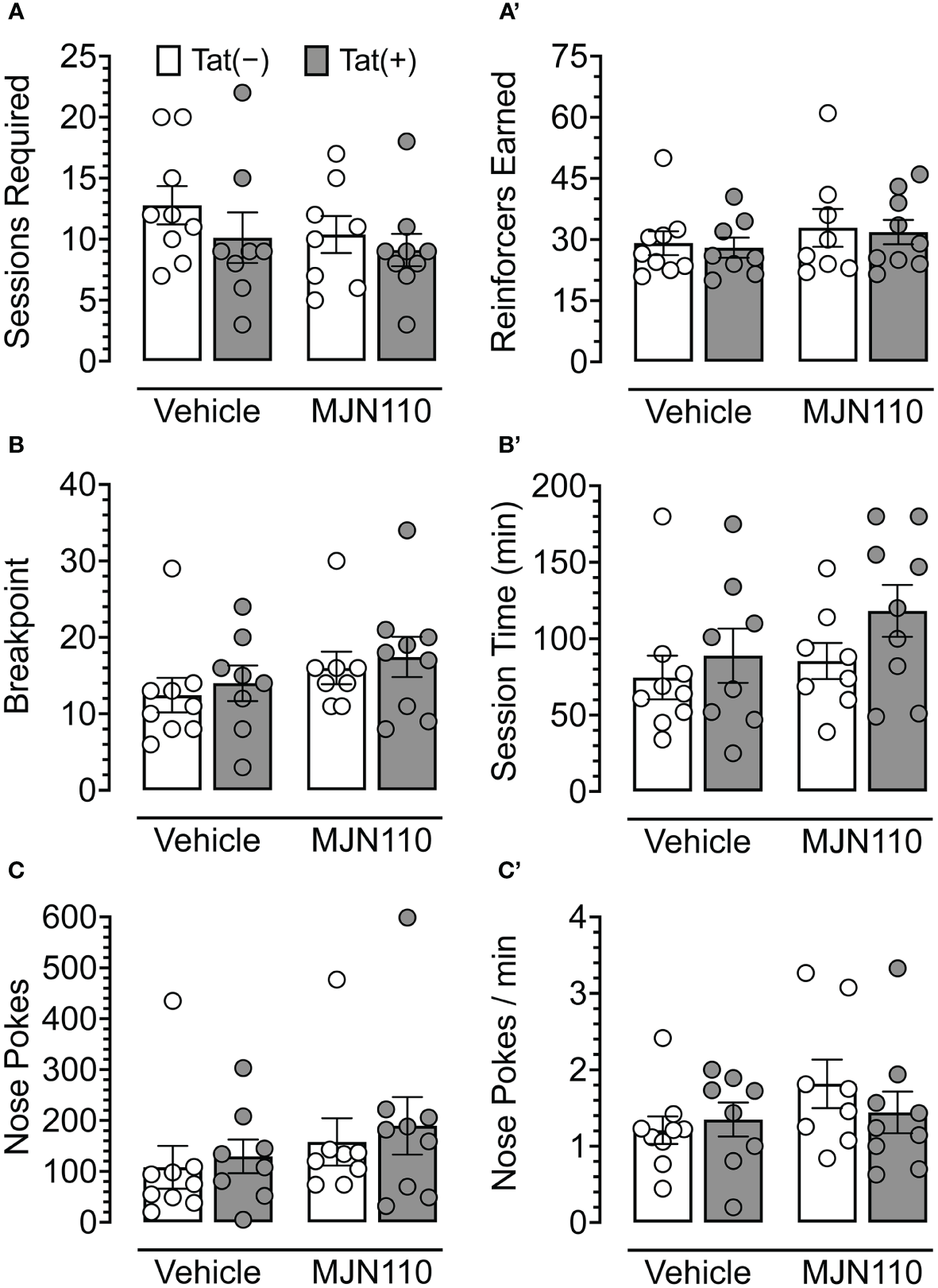 No baseline performance differences were observed between Tat(−) and Tat(+) subjects across drug groups during FR 1 shaping trials, either in the number of sessions required to learn the task (Figure 3A) or the number of reinforcers earned during sessions wherein criteria for advancement to the PFR breakpoint test were met (Figure 3A’). Additionally, no significant differences were observed between Tat(−) and Tat(+) subjects across drug groups during the PFR breakpoint test in measures of breakpoint (Figure 3B), total session time (Figure 3B’), number of nose pokes (Figure 3C), or nose pokes per minute (Figure 3C’). These results indicate that Tat and 1 mg/kg MJN110 demonstrate no significant effects on either reward-related task learning or motivation to exert additional effort to receive a salient reinforcer.