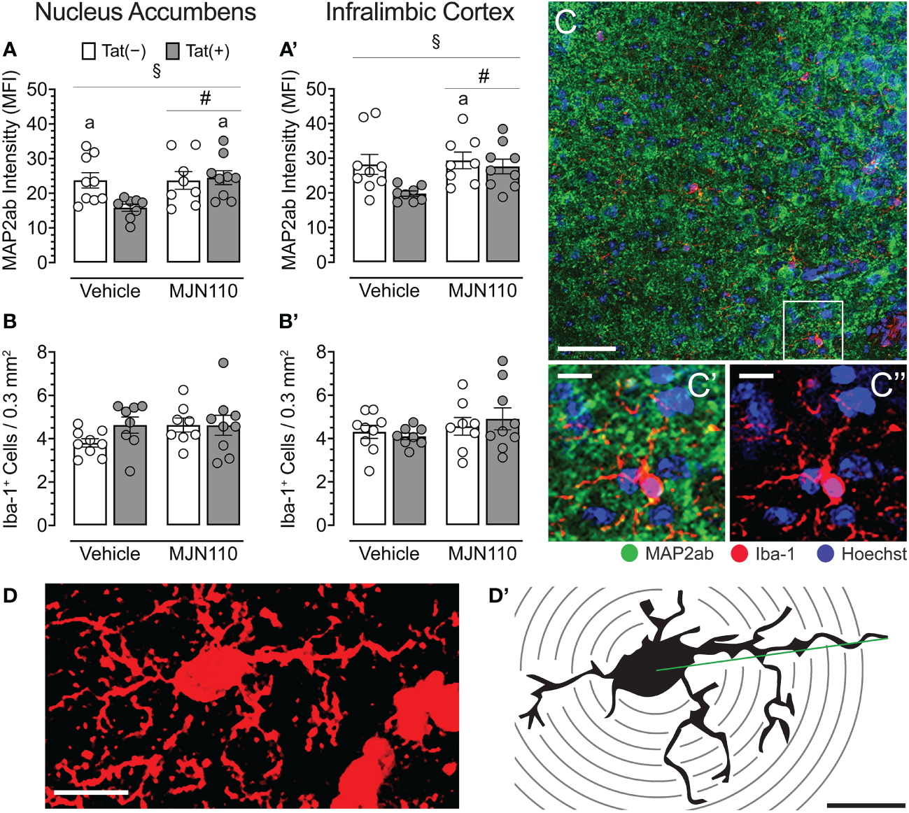 Neuronal dendritic intensity and microglia density/morphology in the nucleus accumbens and infralimbic cortex. (A) In the nucleus accumbens, MJN110 increased neuronal dendritic intensity based on Tat expression, with decreased MAP2ab intensity in vehicle-treated Tat(+) mice compared to MJN110-treated Tat(+) mice and vehicle-exposed Tat(−) mice. (A’) In the infralimbic cortex, the same main effect for drug and drug x genotype interaction was noted, with decreased MAP2ab intensity in vehicle-treated Tat(+) mice compared to MJN110-treated Tat(−) mice. (B, B’) Microglia density was not affected by genotype or drug in the nucleus accumbens or infralimbic cortex. (C) Brain section from the nucleus accumbens of a vehicle-treated Tat(+) mouse taken at 20x (0.3 mm2, Scale bar = 50 µm) and at a higher magnification of MAP2ab intensity and/or microglia Iba-1 (C’ and C’’, Scale bars = 10 μm). (D) Example of an orthogonal projection Iba-1-stained image from the nucleus accumbens used for Sholl analysis (63x, Scale bar = 10 μm, image processed with ImageJ). (D’) Example of a single microglial cell with concentric Sholl radii (black circles) superimposed on the image (Scale bar = 10 μm). All data are expressed as mean ± the standard error of the mean (SEM). Statistical significance was assessed by ANOVAs followed by Tukey’s post hoc tests when appropriate; #p < 0.05 main effect of drug, §p < 0.05 genotype x drug interaction, ap < 0.05 vs. vehicle-treated Tat(+) mice. Individual subject data (averaged across 3-4 images per region) represented by open circles.