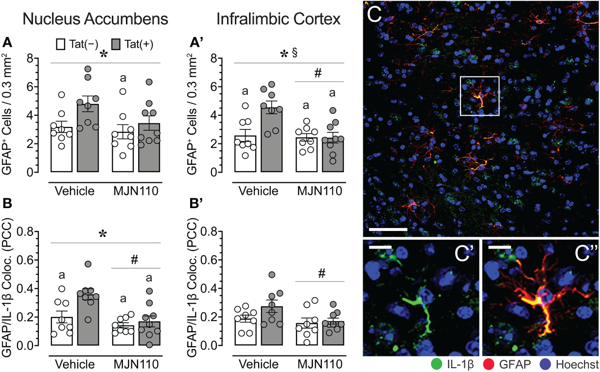 Astrocyte density and astrocytic IL-1β colocalization in the nucleus accumbens and infralimbic cortex. (A) Tat increased astrocyte density in the nucleus accumbens, with increased GFPA+ counts for vehicle-treated Tat(+) mice compared to MJN110-treated Tat(−) mice. (A’) In the infralimbic cortex, MJN110 downregulated Tat-driven increases in astrocyte density based on Tat expression, with increased GFPA+ counts for vehicle-exposed Tat(+) mice compared to all other groups. (B) Colocalization of IL-1β with GFAP+ cells in the nucleus accumbens was significantly affected by Tat and MJN110, with vehicle-exposed Tat(+) mice showing higher colocalization of IL-1β with GFAP+ cells compared to all other groups. (B’) In the infralimbic cortex, colocalization of IL-1β with GFAP+ cells was downregulated by MJN110. (C) Brain section of GFAP+ astrocytes with colocalization of IL-1β from the nucleus accumbens of a vehicle-treated Tat(+) mouse taken at 20x (0.3 mm2, Scale bar = 50 µm) and at a higher magnification (C’ and C’’, Scale bars = 10 μm). All data are expressed as mean ± the standard error of the mean (SEM). Statistical significance was assessed by ANOVAs followed by Tukey’s post hoc tests when appropriate; *p < 0.05 main effect of genotype, #p < 0.01 main effect of drug, §p < 0.05 genotype x drug interaction, ap < 0.05 vs. vehicle-treated Tat(+) mice. Individual subject data (averaged across 3-4 images per region) are represented by open circles. Note that the brain sections of one vehicle-treated Tat(−) mouse were lost due to a processing error during IHC labeling and thus, only 8 individual subject data points are shown for the vehicle-treated Tat(−) mouse group. PCC, Pearson’s colocalization coefficient.