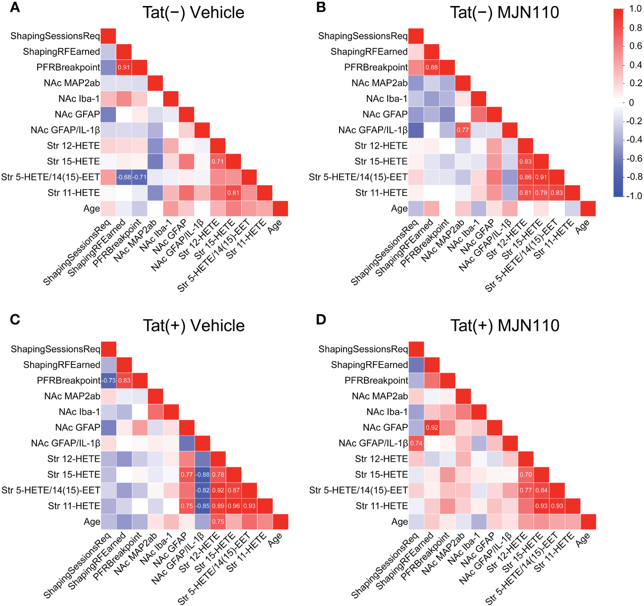 All statistical analyses were performed using SPSS (IBM SPSS Statistics, Version 28, Chicago, IL, USA) and represented visually using GraphPad Prism (GraphPad Software, Inc., Version 9, San Diego, CA, USA) and OriginPro (OriginLab Corporation, Version 2022b, Northampton, MA, USA). Biorender was also utilized to create the experimental schematic depicted in Figure 1. Data are reported as mean ± standard error. Two-way analyses of variance (ANOVAs) with follow-up Tukey’s post hoc tests when appropriate were conducted with genotype [2 levels: Tat(−), Tat(+)] and drug (2 levels: vehicle, MJN110) as between-subjects factors for all but three measures (exceptions detailed as follows). For assessments of body mass, three-way mixed ANOVAs were conducted with time (14 levels: 14 days) as a within-subjects factor and genotype and drug as between-subjects factors. This was then followed up by two-way ANOVAs with genotype and drug as between-subjects factors for each day and Tukey’s post hoc tests when appropriate. For assessments of PFR breakpoint and number of days to acquisition, Shapiro Wilk tests demonstrated residuals failed to meet normality assumptions; as such, Mann-Whitney U nonparametric tests were run to assess the effects of genotype and drug. Pearson correlation coefficients were calculated for three behavioral measures and all striatal-related CNS measures, except for Iba-1+ microglial morphology due to the chosen smaller sample size, and potential relationships between variables were explored. Data were subdivided by genotype and drug groups to obtain the correlation matrices. Pearson’s correlation coefficients were calculated for each pair of continuous variables for each group. This allowed the assessment of the strength and direction of the linear relationship between variables within each group separately. An alpha of p ≤ 0.05 was considered significant for all analyses.