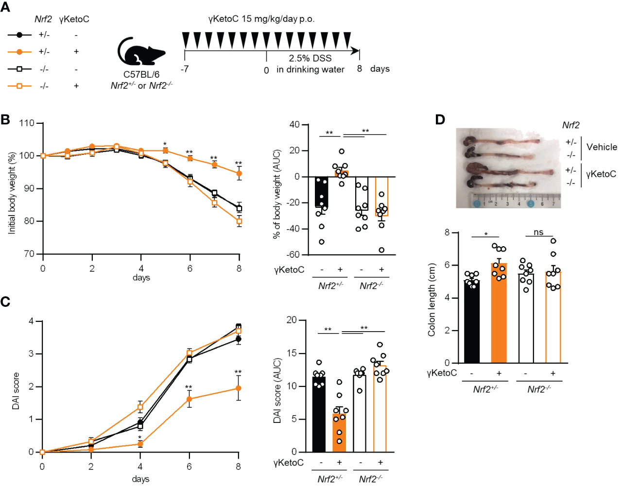 Involvement of NRF2 in the effect of γKetoC on colitis. (A) Schematic of the schedule of administration of γKetoC (15 mg/kg/day) to colitis induced-Nrf2 gene targeted mice. (B) Percent body weight changes (left) and its AUC format (right). (C) DAI score (left) and its AUC format (right). (D) Atrophy levels of the colon. Nrf2+/- γKetoC-; colitis-induced Nrf2+/- mice (n=8), Nrf2+/- γKetoC+; γKetoC-treated colitis-induced Nrf2+/- mice (n=8), Nrf2-/- γKetoC+; colitis-induced Nrf2-/- mice (n=8), Nrf2-/- γKetoC+; γKetoC-treated colitis-induced Nrf2-/- mice (n=8) (A–D). The Tukey-Kramer test was used. Data are shown as the mean ± SEM. *p < 0.05, **p < 0.01, ns, not significant.