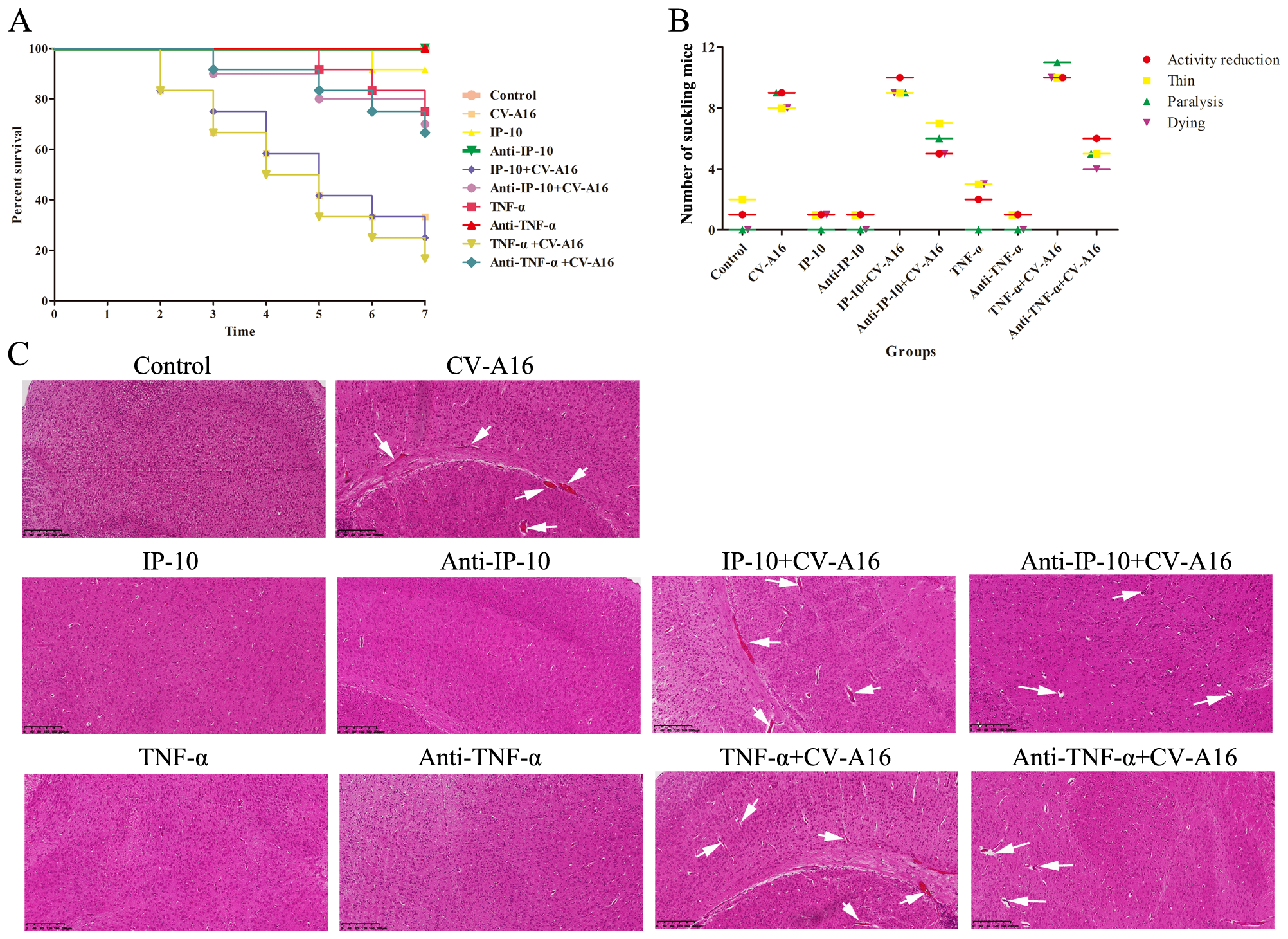 We next used animal experiments to investigate the associations between IP-10 and TNF-α and their role in the pathological injury of the central nervous system caused by CV-A16 infection, we conducted animal experiments. The TNF-α+CV-A16 group presented the most severe clinical symptoms, the lowest survival rate and the most severe pathological changes in brain tissue (Figure 5), but Anti-TNF-α treatment before CV-A16 infection resulted in not only a significant reduction in the clinical symptoms and the degree of pathological injury, but also a significant reduction in the mortality of suckling mice. Although the trends of these indicators in the IP-10+CV-A16 and Anti-IP-10+CV-A16 groups were similar to those in the two groups above, the degree of change in these indicators was significantly lower than that in the two groups above. Therefore, these data suggest that both IP-10 and TNF-α could aggravate the damage caused by CV-A16 infection, and that the effect of TNF-α is more severe. Moreover, compared with IP-10 treatment alone, TNF-α treatment alone resulted in relatively severe clinical symptoms, a relatively lower survival rate and relatively severe pathological changes in brain tissue than IP-10 treatment alone. This result may further confirm our above results shown in Figure 4. As it is downstream of IP-10, TNF-α can directly disrupt BBB permeability by destroying intercellular connections; thus, the reason that the relatively more severe effect of TNF-α alone than of IP-10 alone may be because TNF-α acts directly on the BBB, while IP-10 acts indirectly via TNF-α.