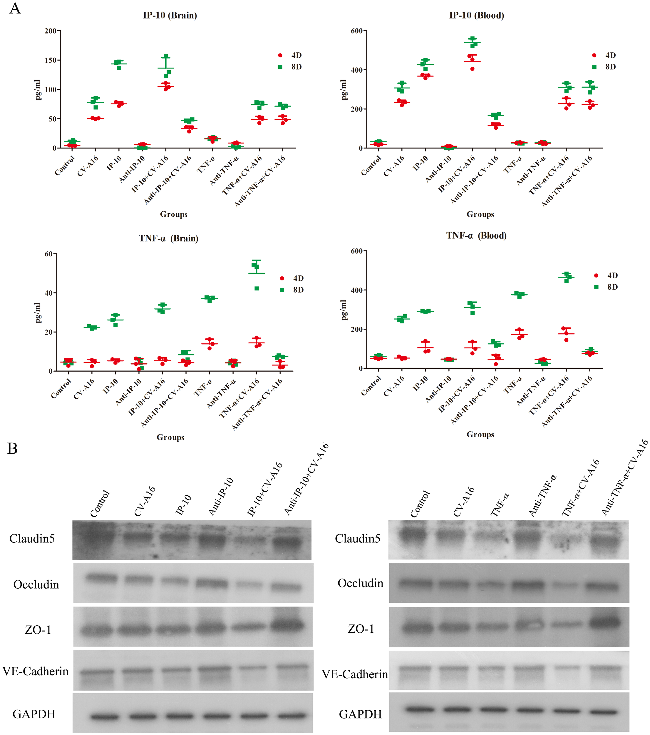 Next, we measured the concentrations of IP-10 and TNF-α in brain tissues and blood on Day 4 and Day 8 after different treatments. As shown in Figure 6A, IP-10 expression was upregulated in the brain tissue and blood of all the groups infected with CV-A16 compared with the control group on both Day 4 and Day 8. Moreover, IP-10 production in the TNF-α+CV-A16 and Anti-TNF-α+CV-A16 groups was not significantly different from that in the CV-A16 group. In addition, there were no differences between the TNF-α/Anti-TNF-α group and the Control group. These results indicate that CV-A16 infection may promote IP-10 production from the beginning of infection and that TNF-α is not associated with IP-10 production. However, TNF-α expression in the brain tissue and blood in the CV-A16 group was not altered on Day 4, but did increase on Day 8. Additionally, TNF-α expression was gradually upregulated in the IP-10, IP-10+CV-A16, TNF-α and TNF-α+CV-A16 groups. These data indicate that CV-A16 infection may increase TNF-α release at later stages of infection and IP-10 induces the release of TNF-α.
