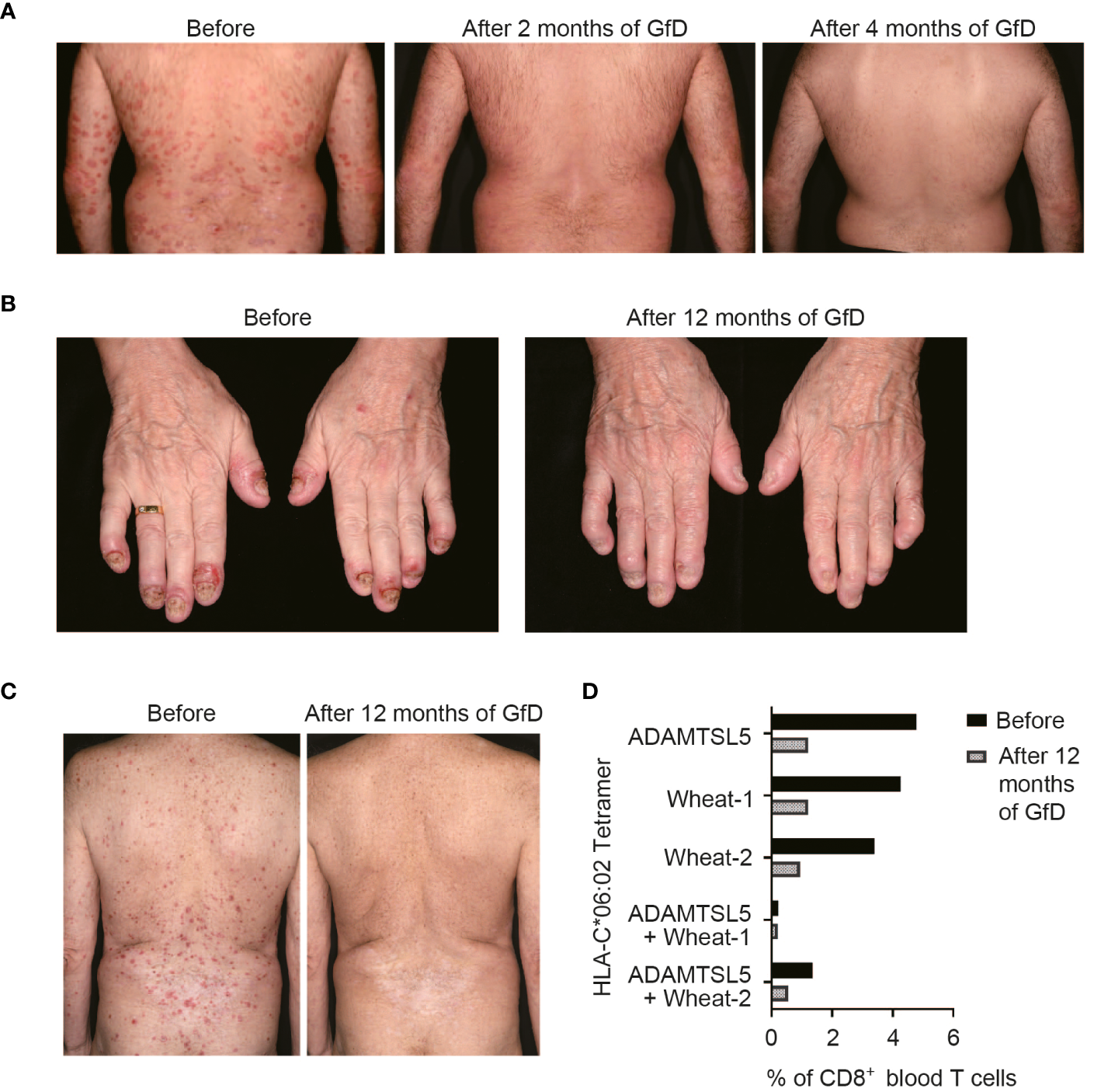 Psoriasis may improve upon a gluten-free diet (GfD). (A) Without any change in the therapeutic management, the previously refractory psoriasis cleared within two months upon a GfD in patient #7. (B) The formerly treatment-resistant, highly painful DIP-arthritis in patient #10 resolved completely on a GfD, without the need for further treatment. (C) Stable psoriasis remission following discontinuation of methotrexate and adalimumab treatment during GfD in patient #12. In this patient, live/CD3+CD8+CD56- single or double tetramer-stained cells were measured by flow cytometry before and 12 months after starting GfD (D). Patient data are given in Table 1.